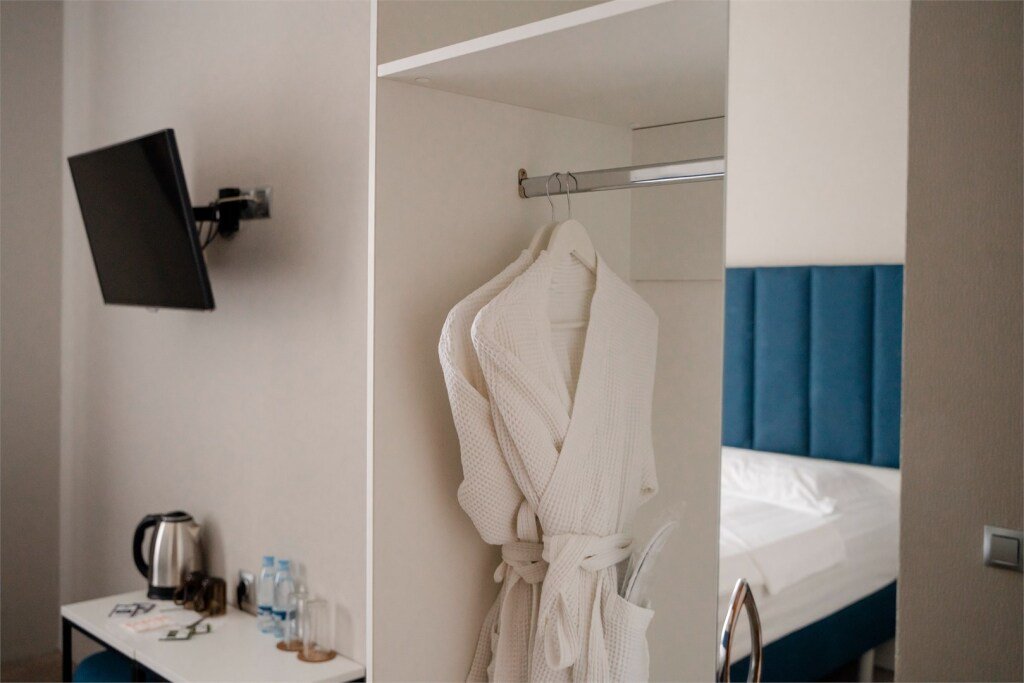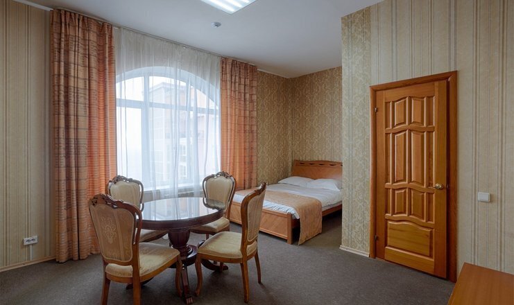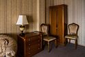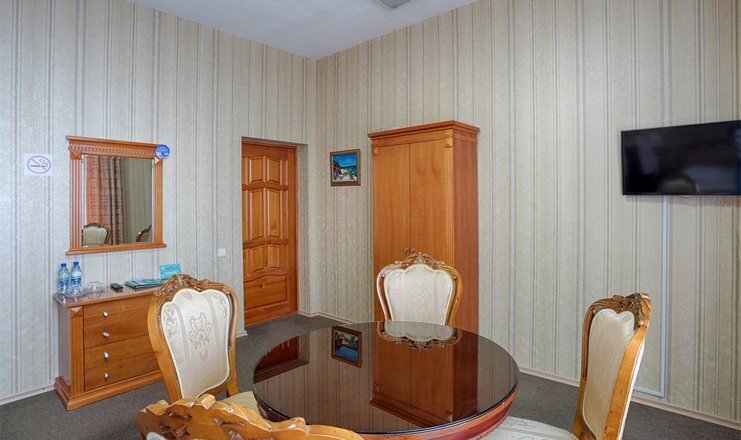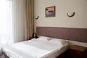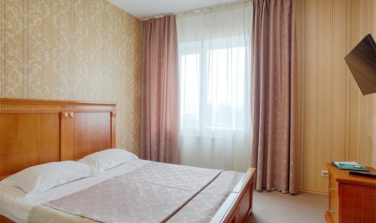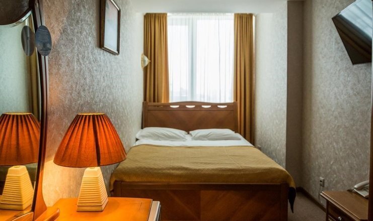 Интерьер оформлен в пастельных тонах, на полу — ковровое покрытие высокого качества. Мебель из натурального дерева порадует удобством и красотой. В каждом номере есть одна двуспальная кровать, шкаф, прикроватная тумба, комод, зеркало, телевизор, ванная комната.