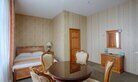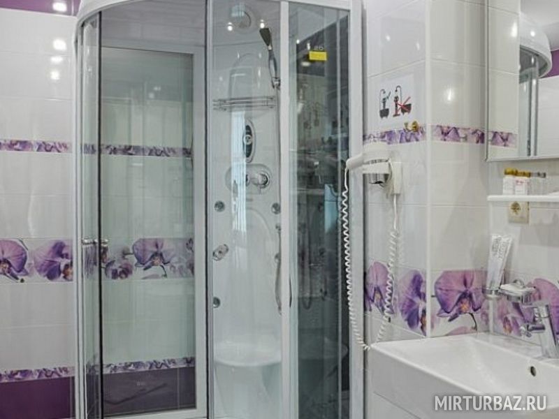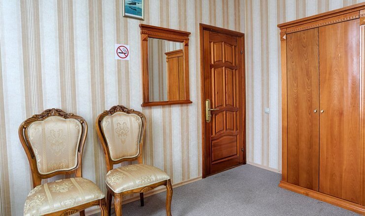 Номер расположен в дополнительном корпусе Маячок. Лифт отсутствует. Интерьер оформлен в пастельных тонах, на полу — ковровое покрытие высокого качества. Мебель из натурального дерева порадует удобством и красотой.