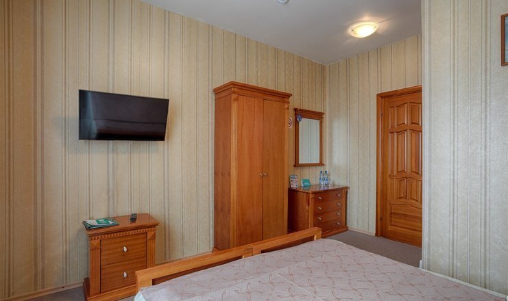 В каждом номере есть одна двухспальная кровать, плательный шкаф, прикроватная тумба, комод, зеркало, полноценная ванная комната, трюмо с зеркалом. Номер находится в дополнительном корпусе Маячок. Лифт отсутствует.