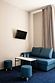 Интерьер оформлен в пастельных тонах, на полу — ковровое покрытие высокого качества. Мебель из натурального дерева порадует удобством и красотой.
