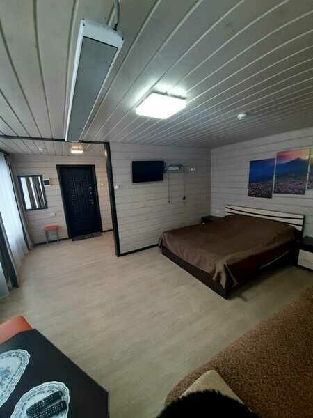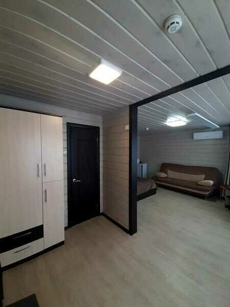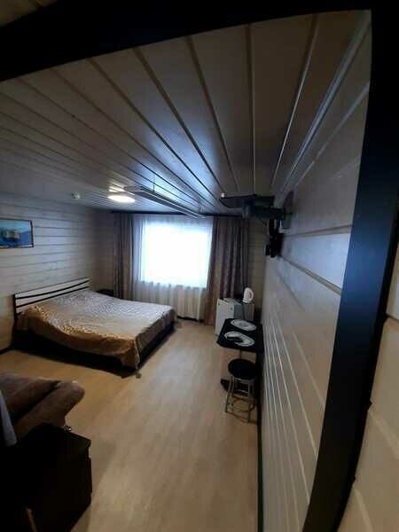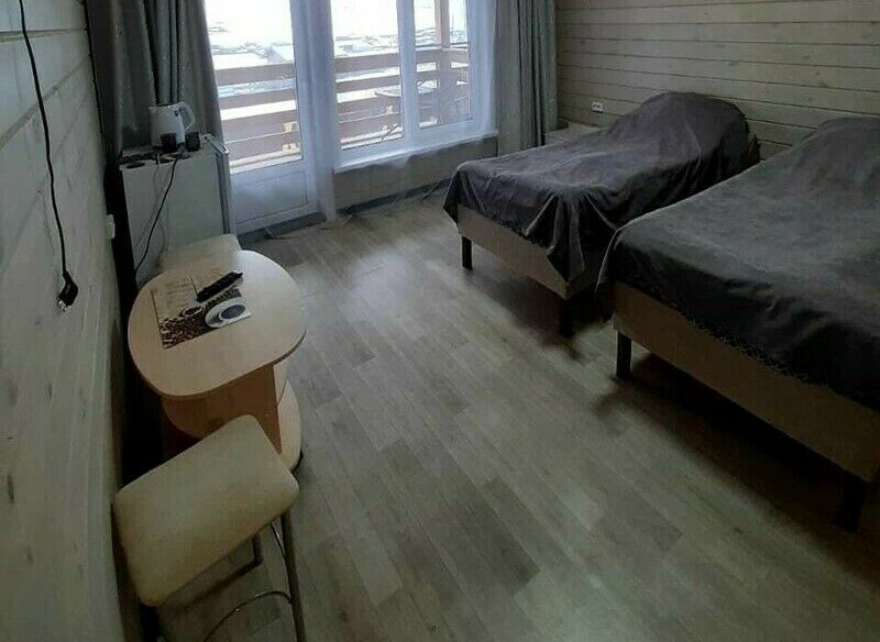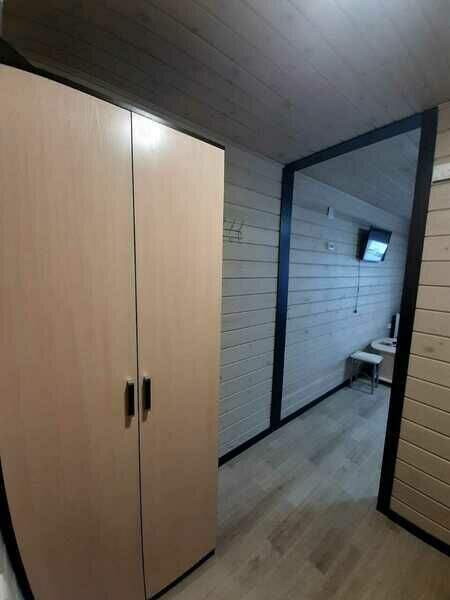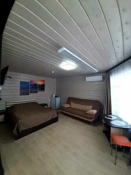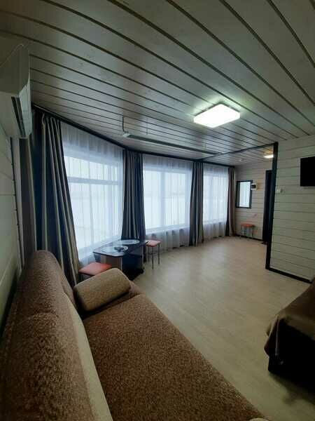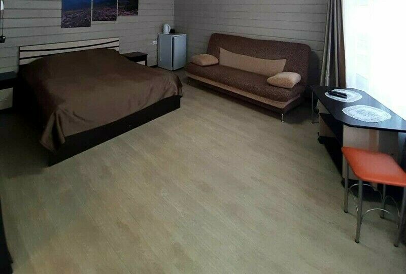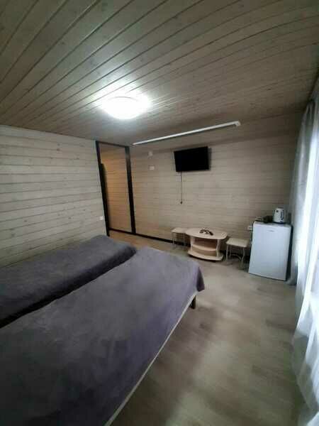 Номер 24 кв.м., с террасой, отдельный вход в номер. В номере: санузел с душевой кабиной, двуспальная и односпальная кровати, прихожая, тумбочки, ЖК телевизор, чайник, мини-холодильник, чайные пары, журнальный столик, стулья.