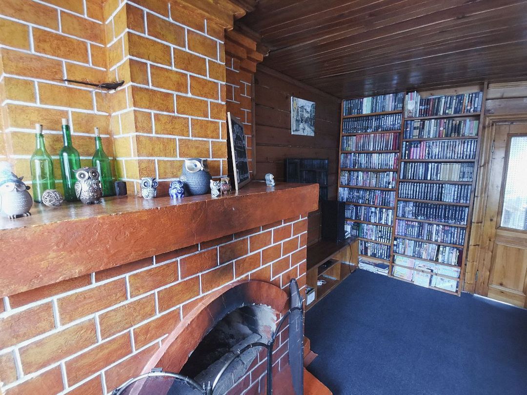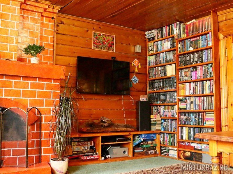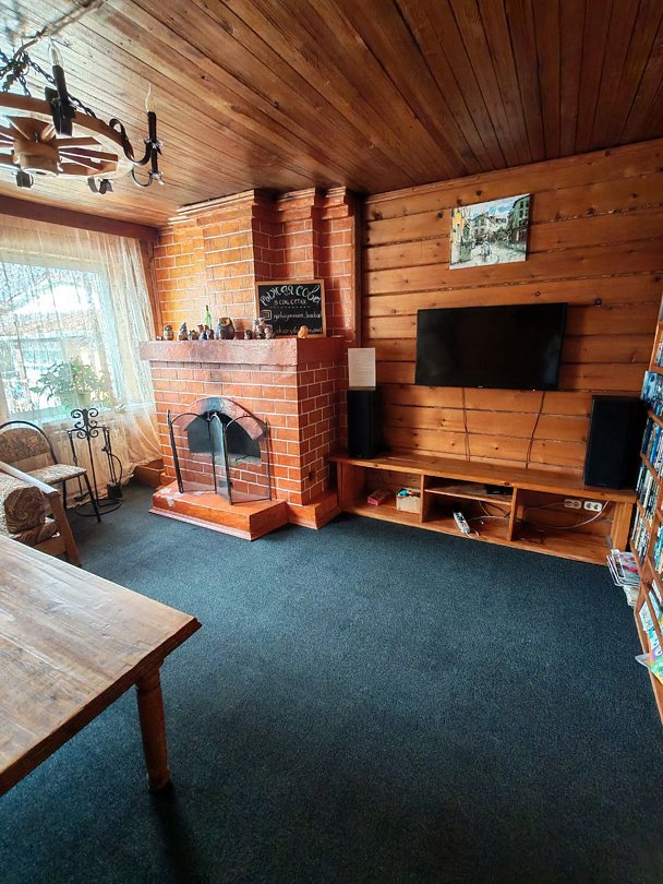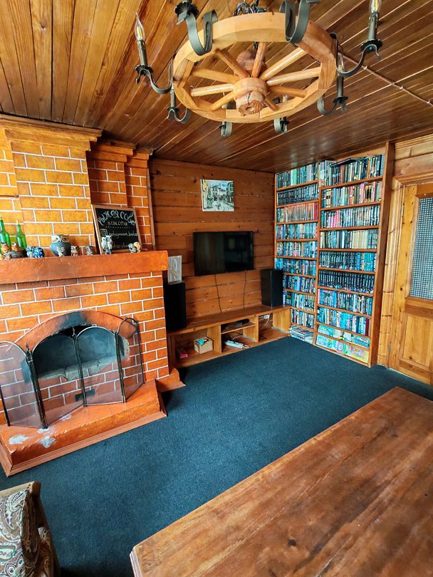 Уютный общий зал для гостей. Здесь есть камин, Wi-Fi, Sony PS3, библиотека с классической и современной литературой, телевизор, кабельное, большое количество фильмов, мультиков и музыки, настольные игры для любого возраста, гитара, удобный большой диван. Всем, кроме камина, гости могут пользоваться бесплатно.