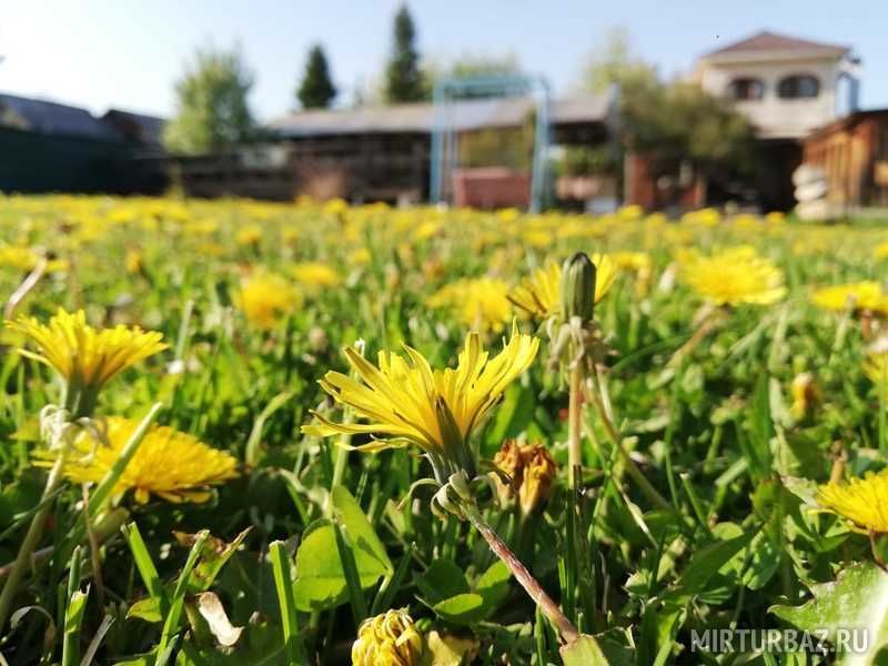 На территории есть большая лужайка с естественным газоном, летом превращается в поле клевера, одуванчиков или подорожника. Раздолье для детей и взрослых, любящих бегать босиком по траве.