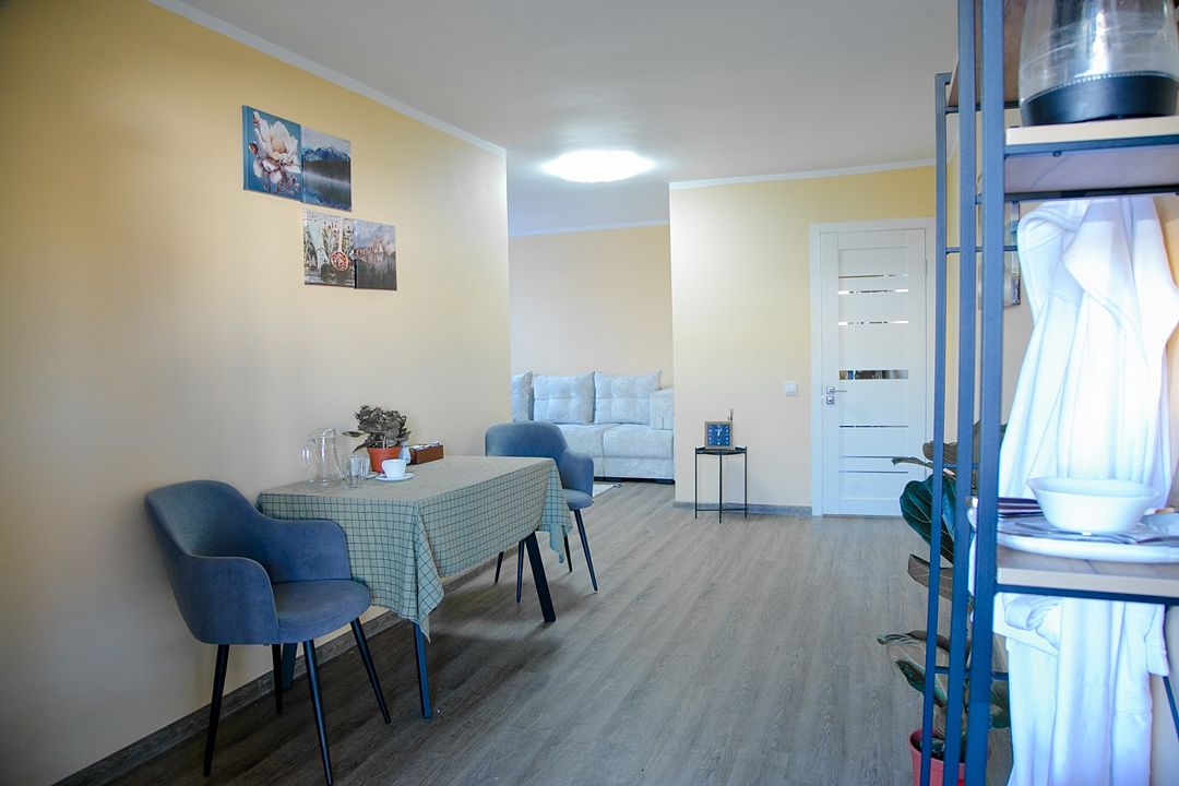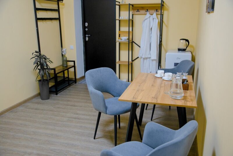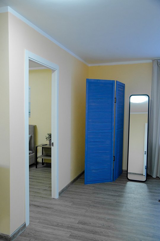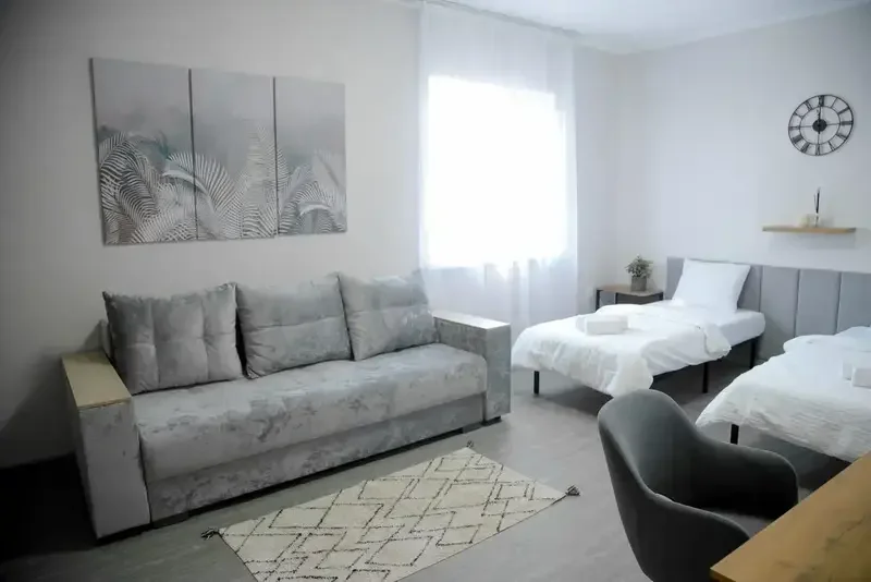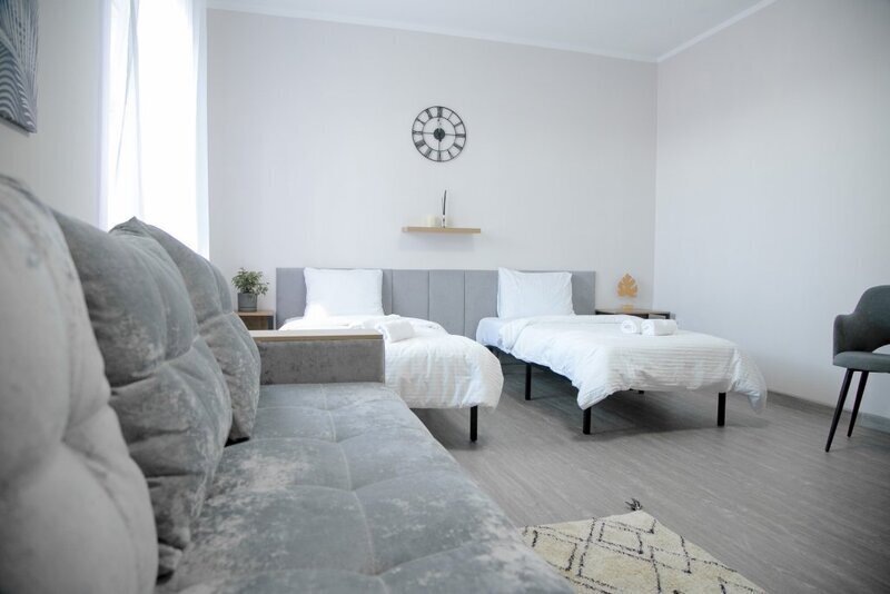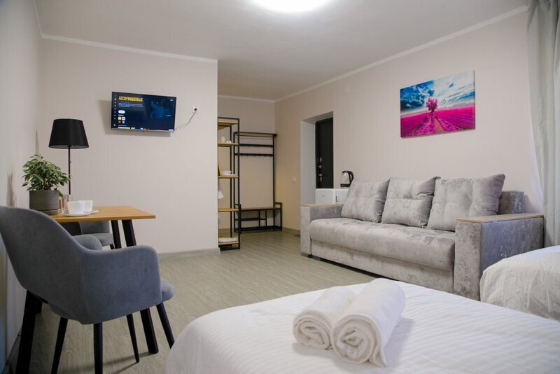 Благоустроенный номер с двумя раздельными кроватями и диваном. Вместительностью до 4х человек. Телевизор, чайник, фен, холодильник, теплый пол.