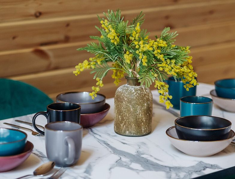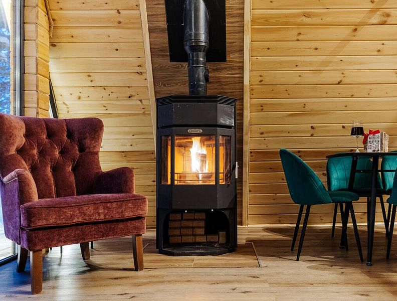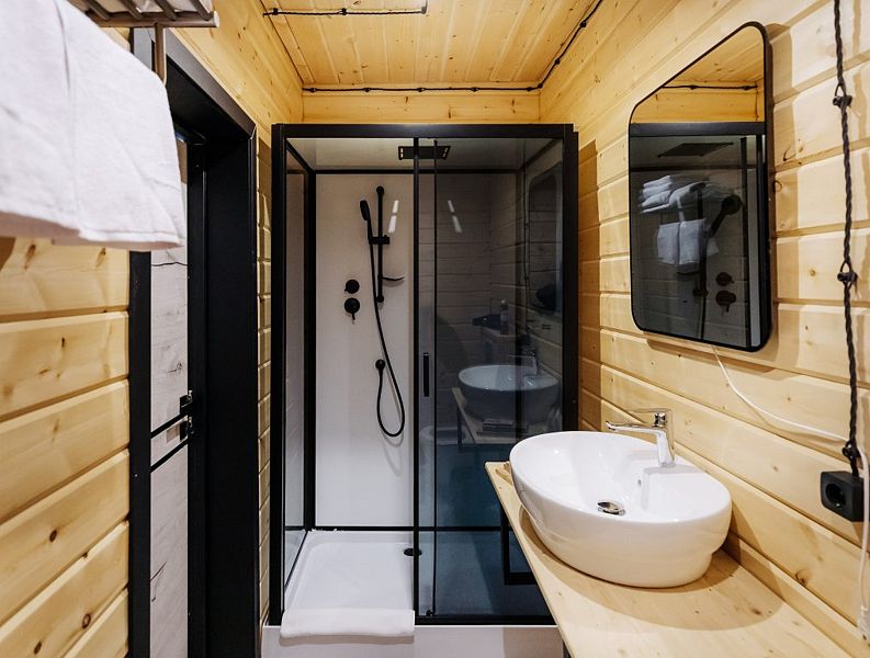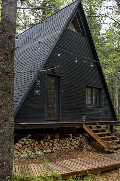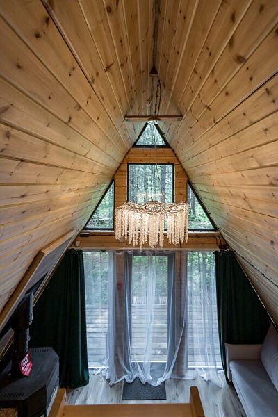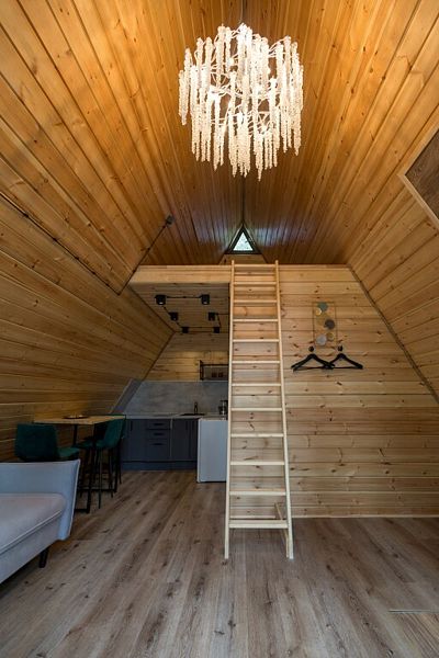 На территории расположены дома в стиле а-фрейм, в которых гости найдут спальни, гостиные, оборудованные кухни, собственные камины и панорамные окна с видом на тайгу, а также террасу.