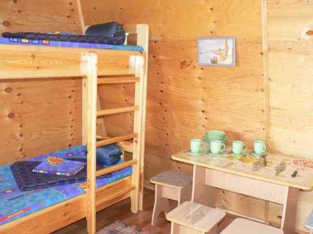 Кровать с постельным бельем, шерстяными одеялами и спальниками (на случай холодных ночей), стол со стульями, газовая плита и комплект посуды. На прилегающей территории имеется стоянка для автомобилей, два туалета и летний душ.