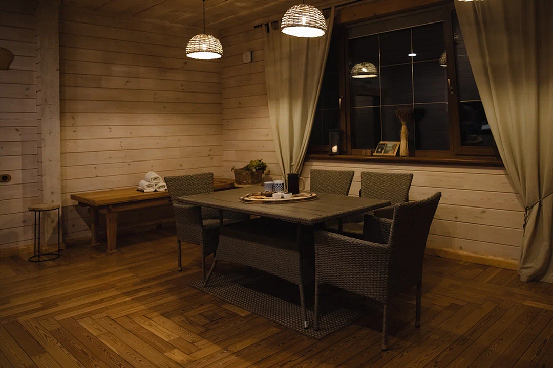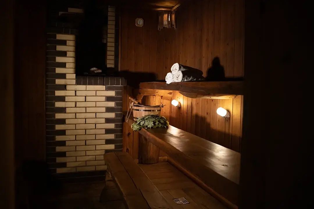 На территории представлены: ресторан с панорамным видом и живым огнём, банный комплекс с русской парной и крытым бассейном. Также имеется внутренний сад с детской площадкой.