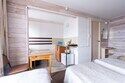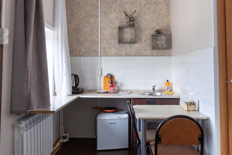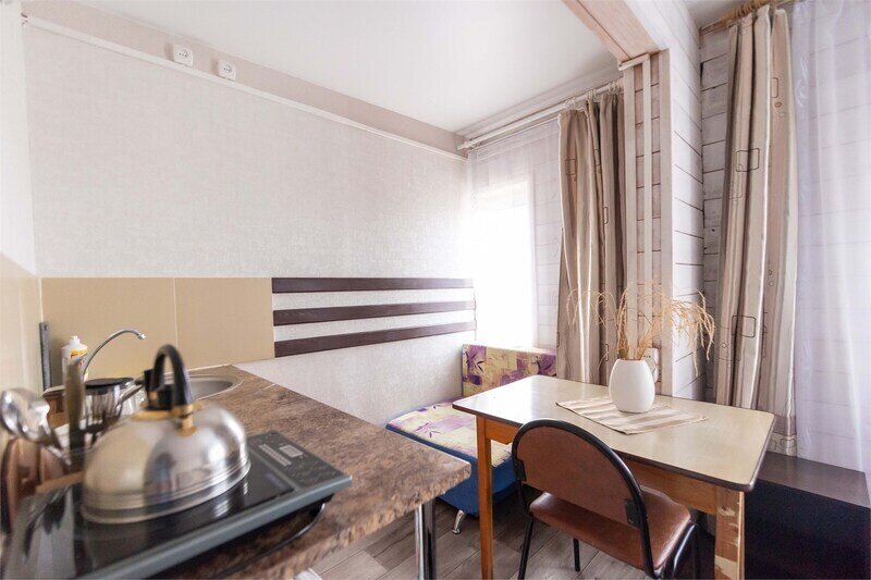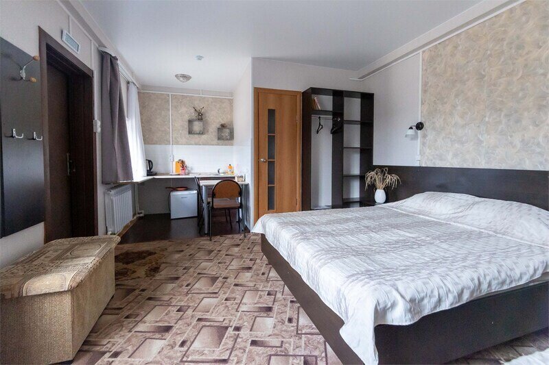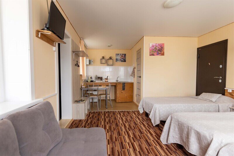 Номер студия с отдельным входом и своим балкончиком, есть зона кухни для приготовления еды, индукционная плитка, посуда, первая линия.