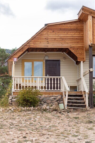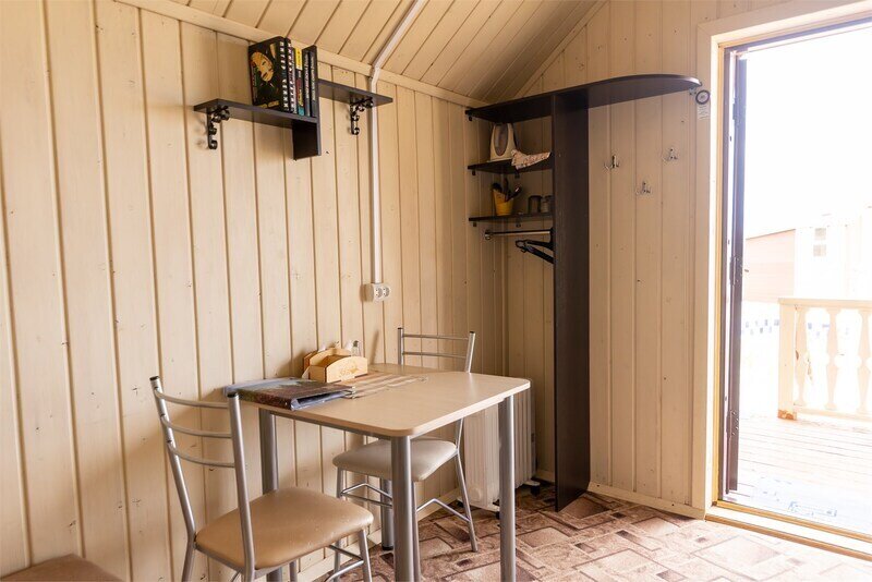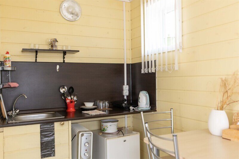 Дом бунгало со своей мангальной зоной и верандой со скамейками и столом, уютный индивидуальная зона отдыха. Мини-кухня с посудой для приготовления еды, индукционная плитка, чайник, мини холодильник, обеденный стол, стулья.