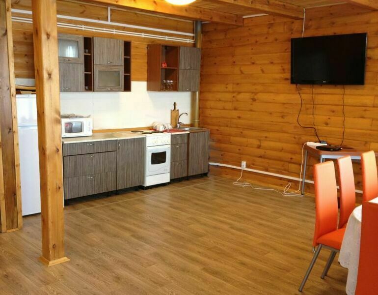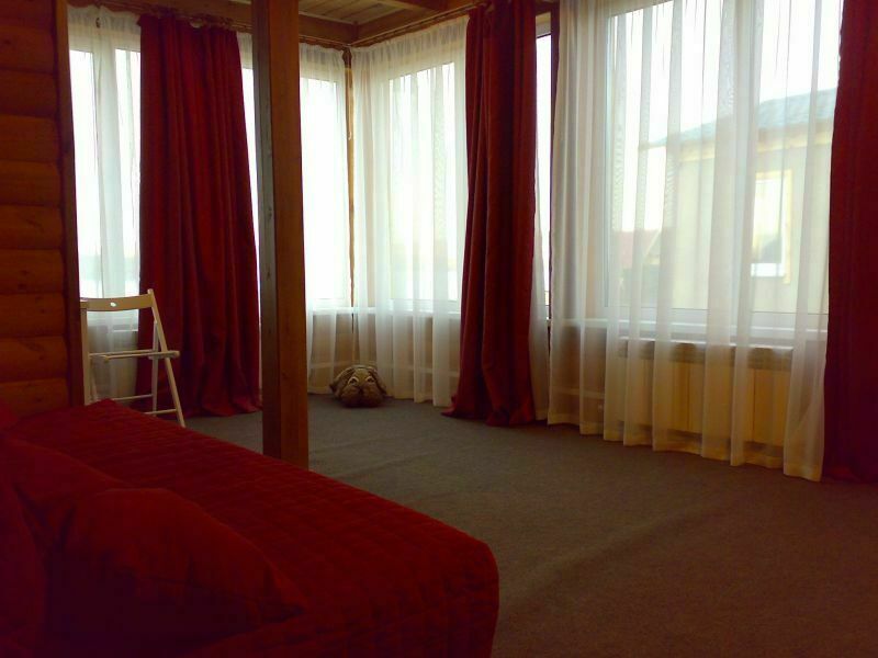 Санузел один на три номера, в номерах шкаф, кровати комплект постельного белья, зеркало, тумбочки. На первом этаже кухня и гостиная с телевизором