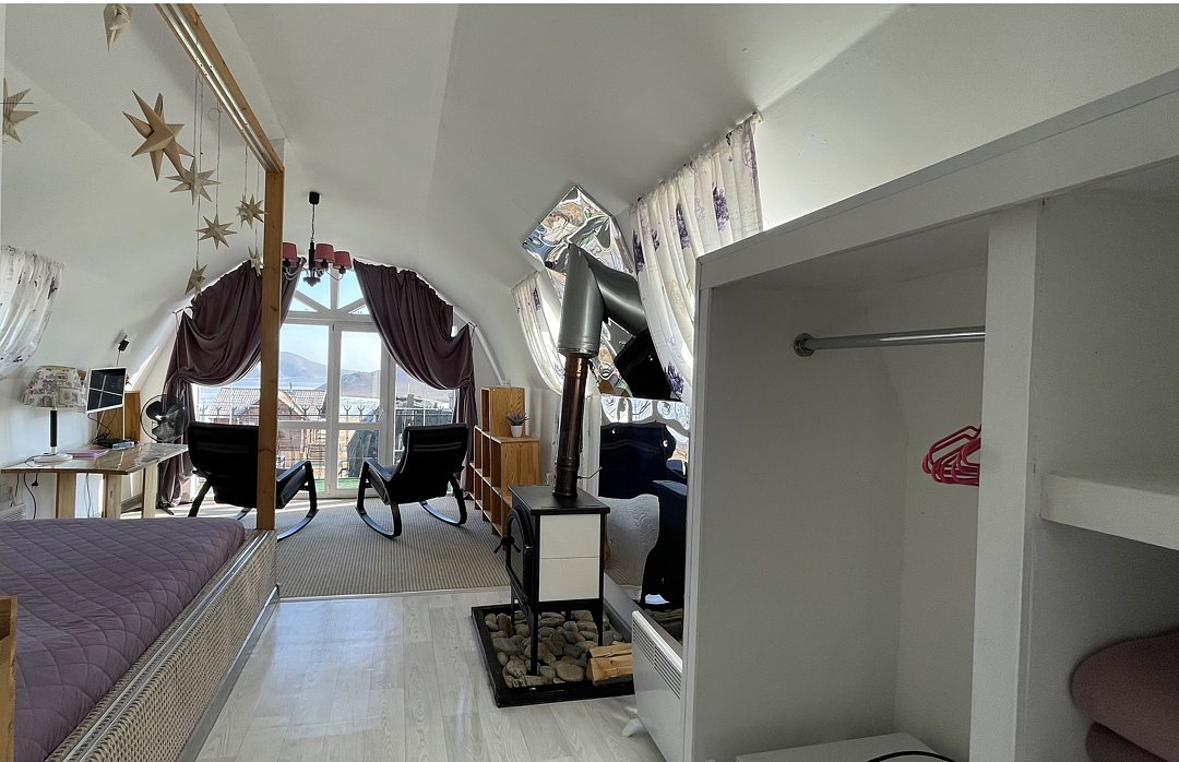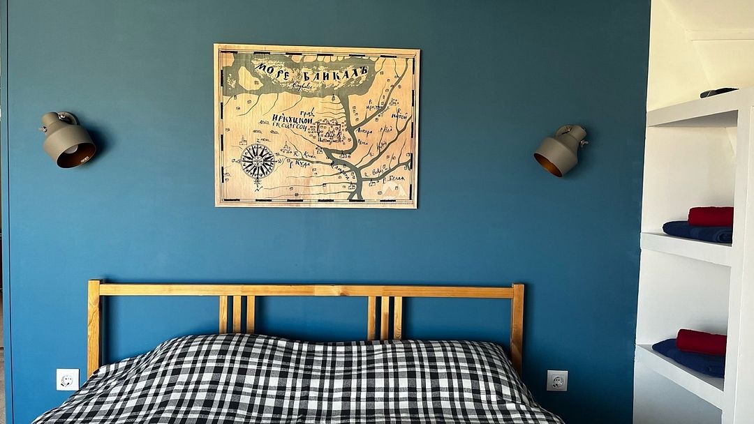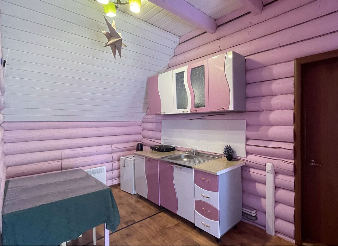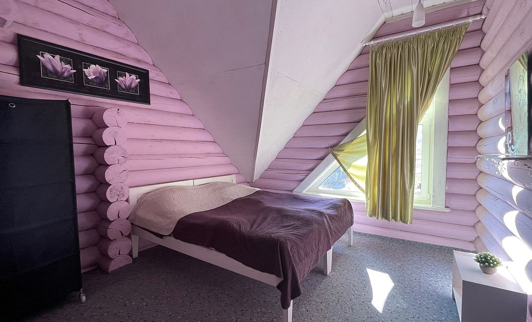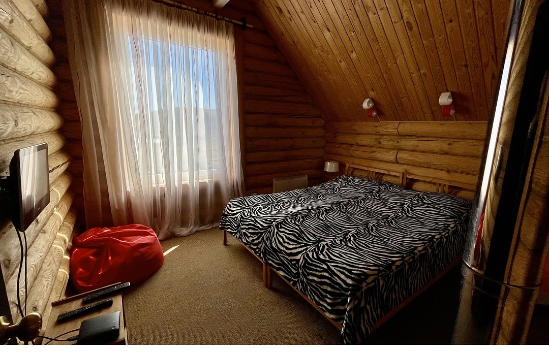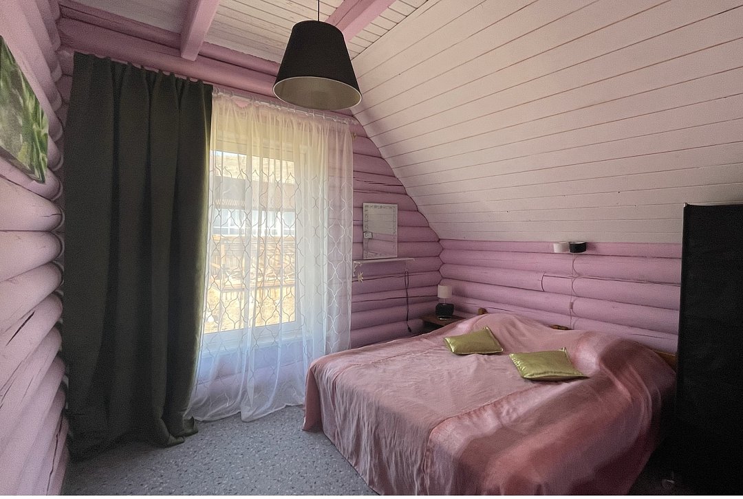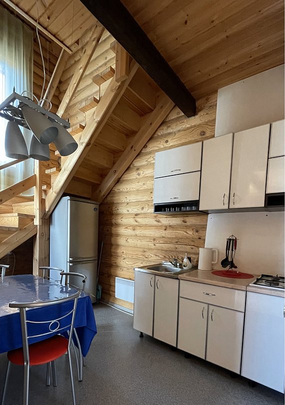 Расположен в классическом деревянном доме: один на первом этаже (бежевые стены), другой — на втором (сиреневые стены). Вход в каждый автономен. Планировка: зал, кухня, 2 двухместные спальни, один санузел. Вид из окон на окрестности (без вида на Байкал). Максимальное количество — 6 человек (диван в зале как дополнительное место на два человека). Спальные места: односпальные кровати (можно сдвигать / раздвигать) на первом этаже, Двуспальная и две односпальные — на втором. Климат: электрообогрев. Благоустройство: унитаз, душевая кабина, раковина, фен. Оснащение на кухне: стол, 4 табурета, плита, холодильник, набор кастрюль, сковорода, чайник, кружки, чашки, тарелки, столовые приборы. В зале — спутниковое ТВ.