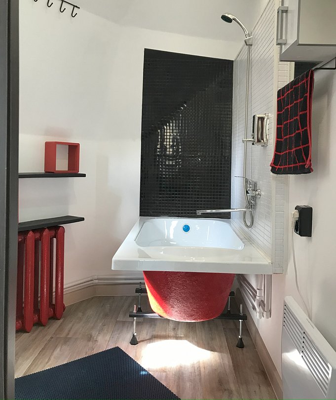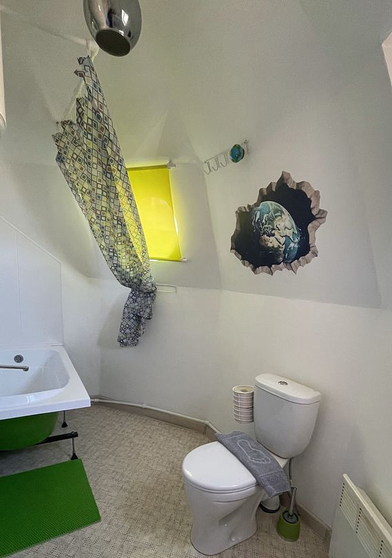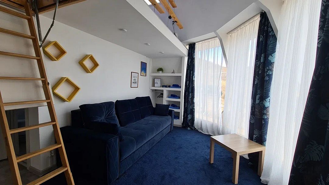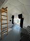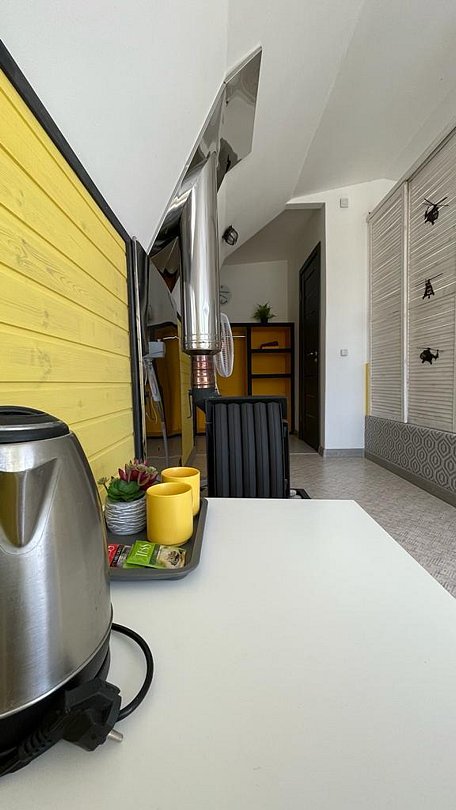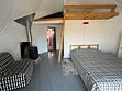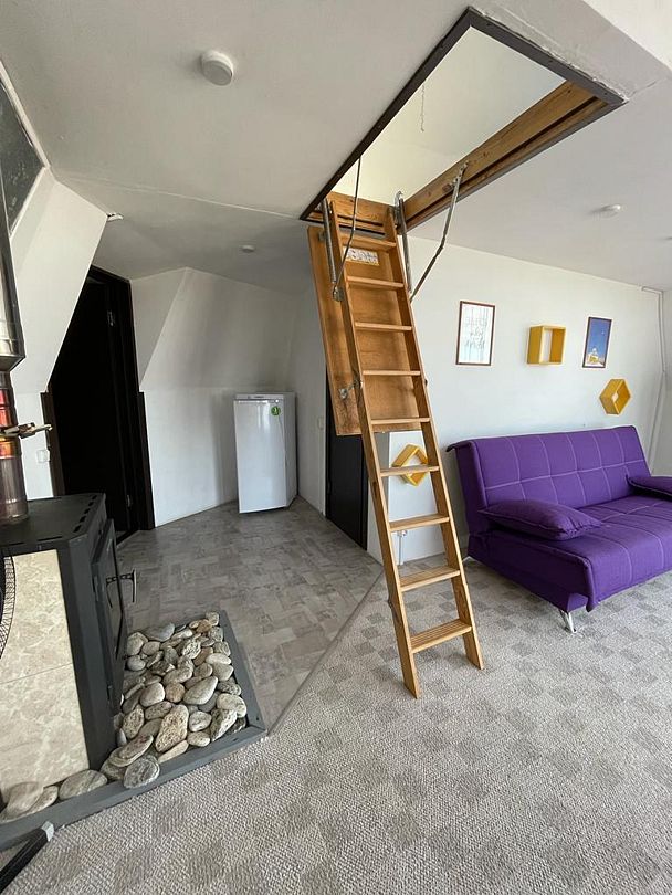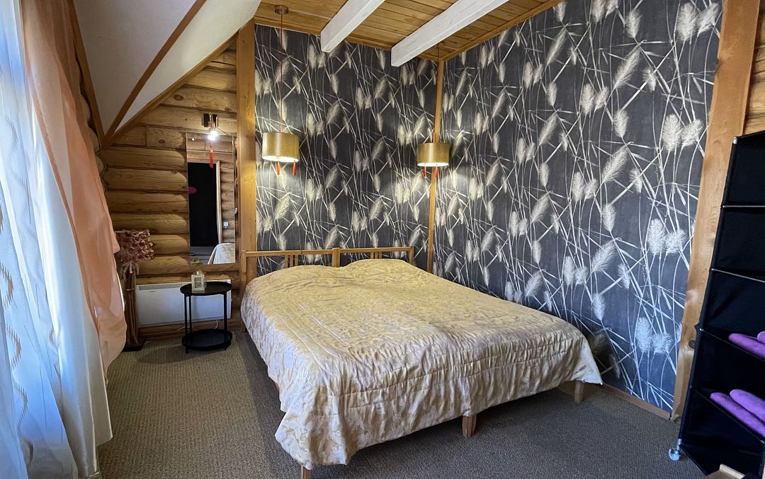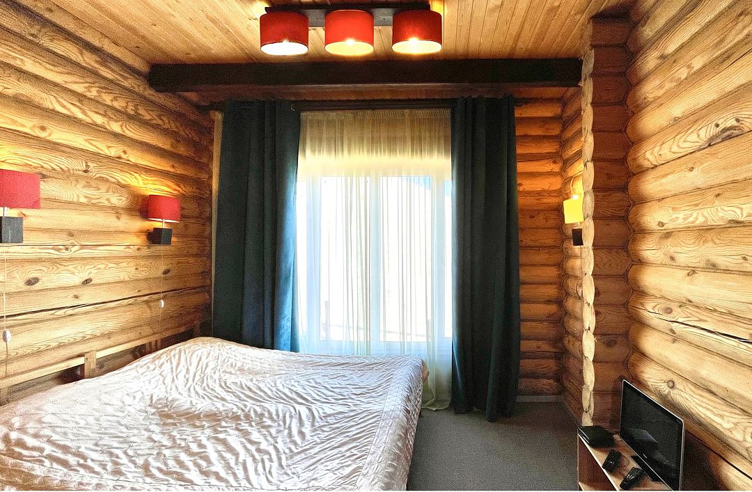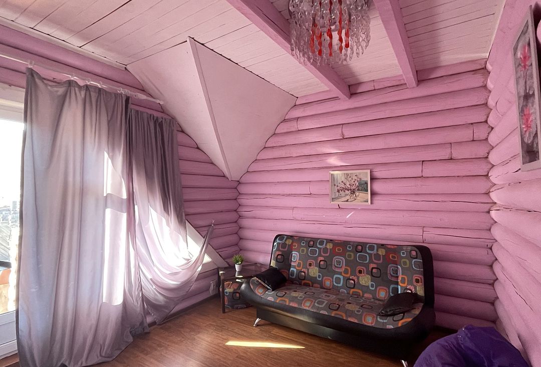 Расположен в классическом деревянном доме: один на первом этаже (бежевые стены), другой — на втором (сиреневые стены). Вход в каждый автономен. Планировка: зал, кухня, 2 двухместные спальни, один санузел. Вид из окон на окрестности (без вида на Байкал). Максимальное количество — 6 человек (диван в зале как дополнительное место на два человека). Спальные места: односпальные кровати (можно сдвигать / раздвигать) на первом этаже, Двуспальная и две односпальные — на втором. Климат: электрообогрев. Благоустройство: унитаз, душевая кабина, раковина, фен. Оснащение на кухне: стол, 4 табурета, плита, холодильник, набор кастрюль, сковорода, чайник, кружки, чашки, тарелки, столовые приборы. В зале — спутниковое ТВ.