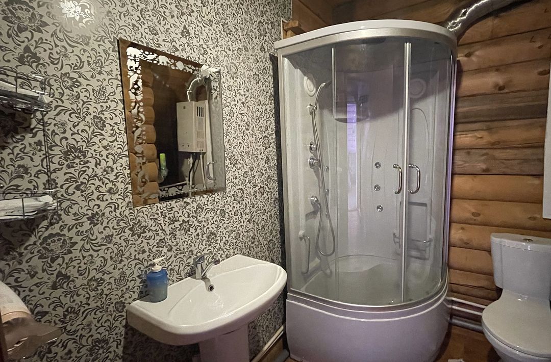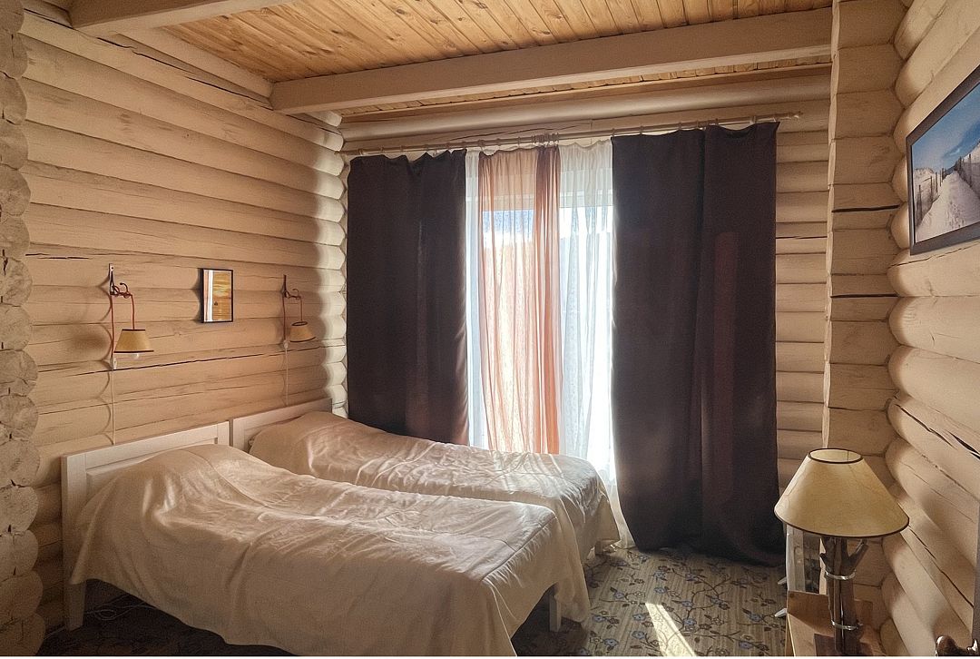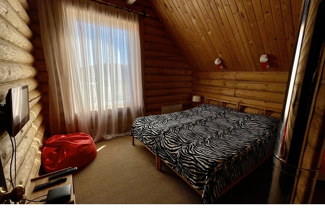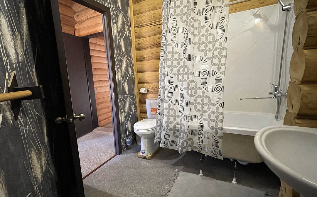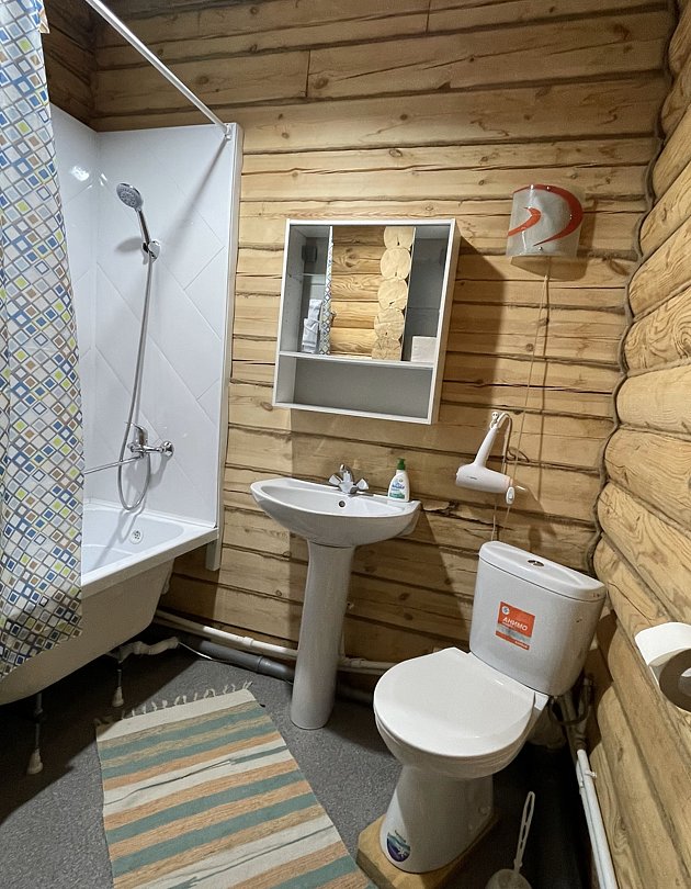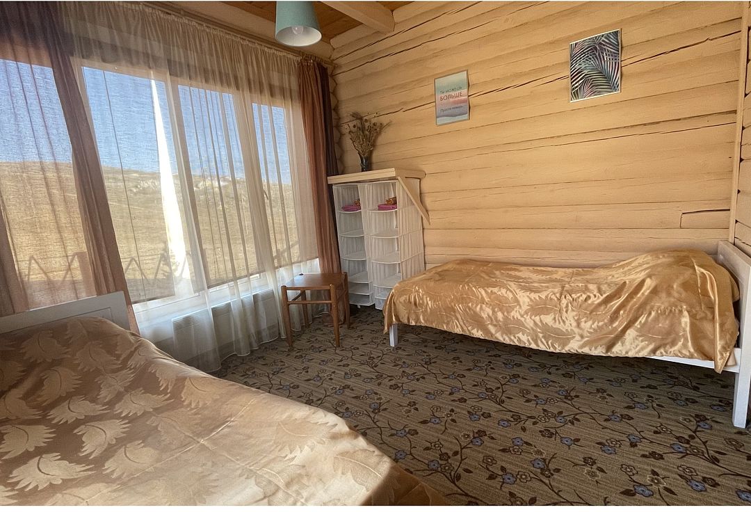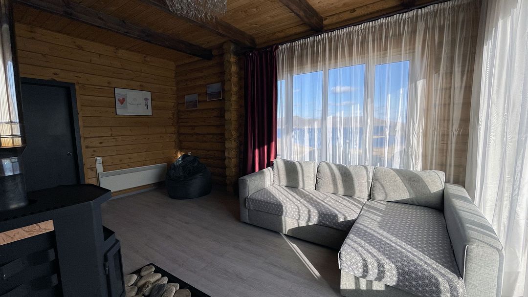 Классический двухэтажный деревянный дом. Первый этаж: гостиная с камином и панорамным видом на Байкал, оборудованная кухонная зона, двухместный номер. Второй этаж: двухместный номер, трёхместный номер с балконом. Все номера имеют индивидуальный санузел. В зале двуспальный диван можно использовать как одно/ два дополнительных места (зона проходная). Спальные места: односпальные кровати (можно сдвигать - раздвигать) Климат: печь-камин, электрообогрев. Благоустройство: унитаз, ванна, раковина. Оснащение на кухне: стол, 4 стула, плита, холодильник, набор кастрюль, сковорода, чайник, кружки, чашки, тарелки, столовые приборы.