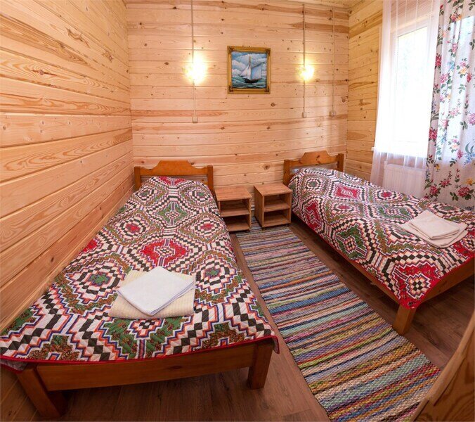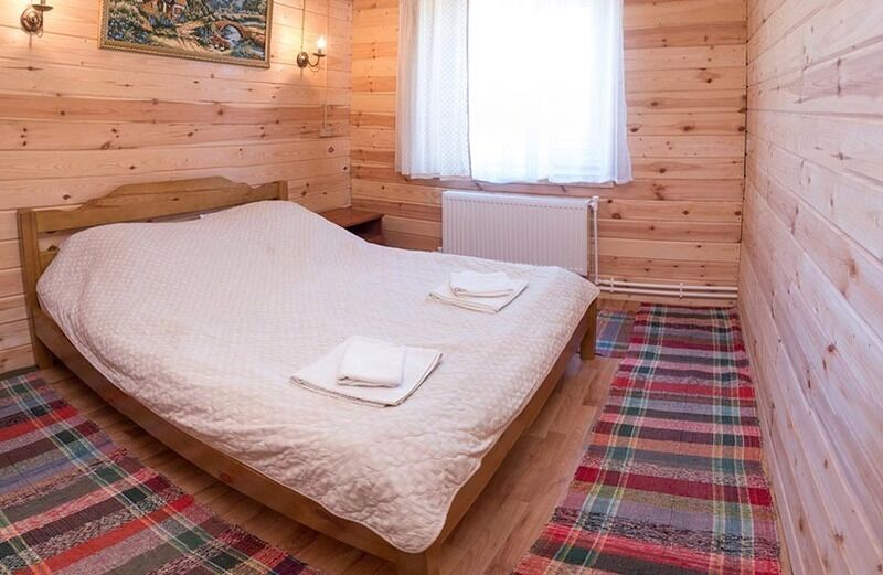 В доме все удобства: 2 спальни: одна - с двуспальной кроватью, шкафом, прикроватными тумбочками, в другой – 2 односпальные кровати, зона с чайным столиком , мягкой мебелью, ЖК-телевизором, чайником, набором необходимой посуды. Вся мебель в доме ручной работы, сделана из дерева, что особенно важно для людей, заботящихся о своем здоровье. Домик оснащен холодильником. Санузел, горячая вода, ванная, мыльные принадлежности.