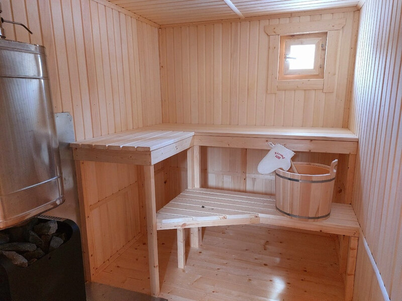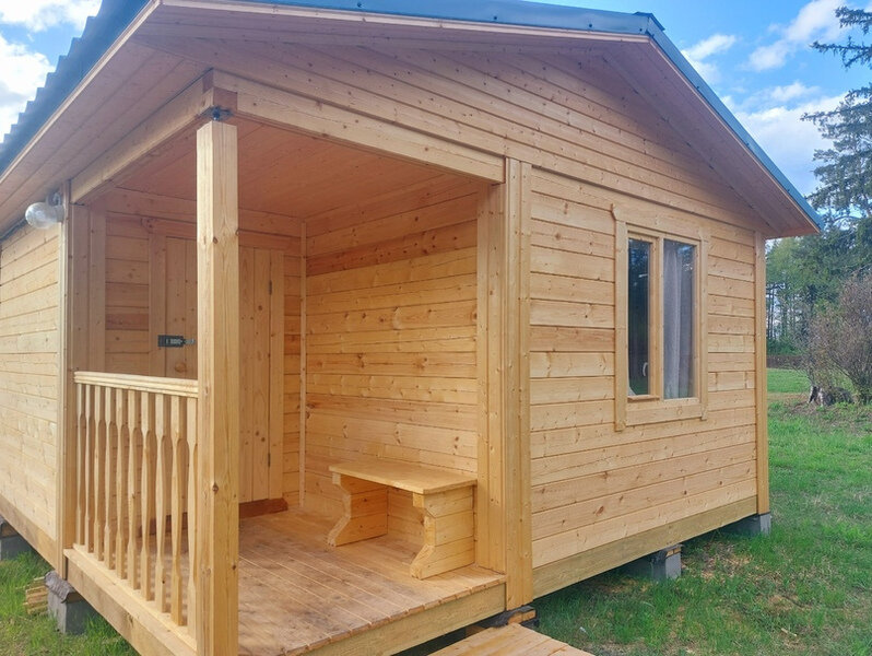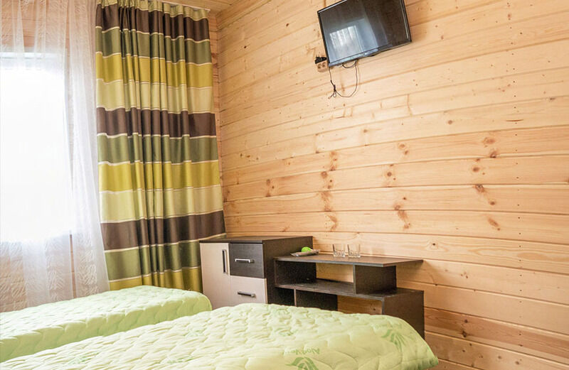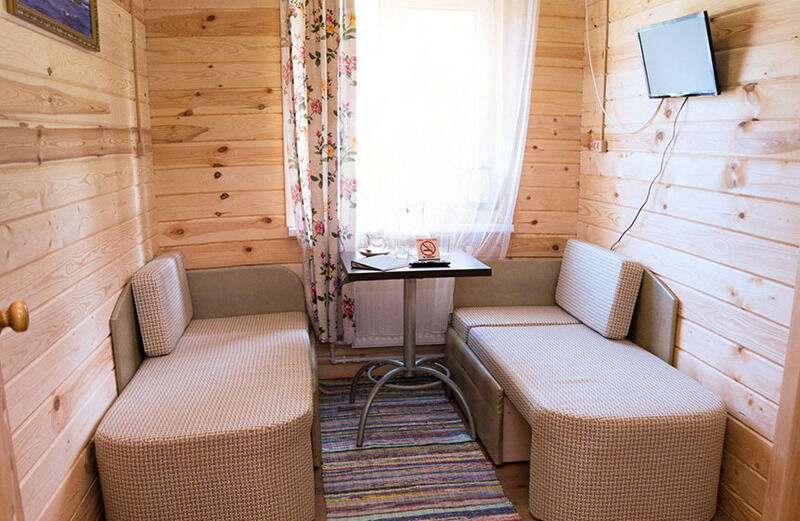 В доме все удобства: уютная спальня с двумя односпальными кроватями, которые пр необходимости можно поставить вместе, гостиная с чайным столиком ЖК-телевизором, чайником, набором необходимой посуды. Часть мебель в доме ручной работы, сделана из дерева, что особенно важно для людей, заботящихся о своем здоровье.