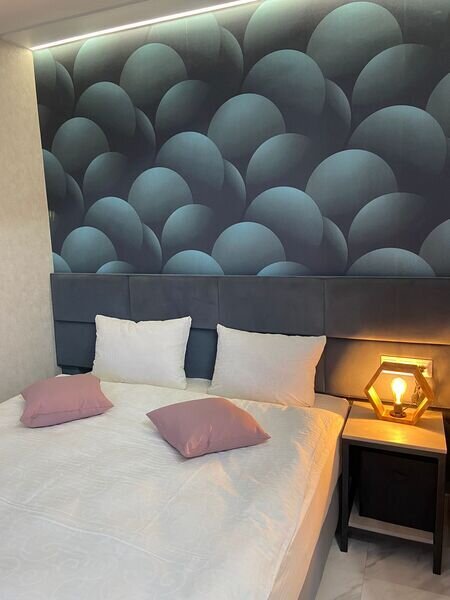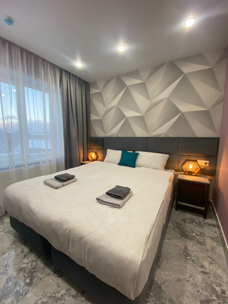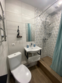 Санузел с душем, ТВ, стол, стул, двухспальная кровать