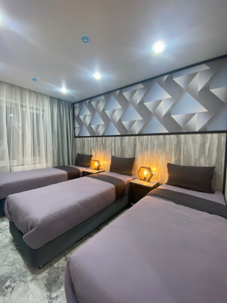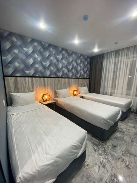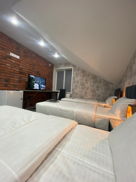 Санузел с душем, ТВ, стол, стул, холодильник, 4 односпальные кровати