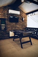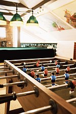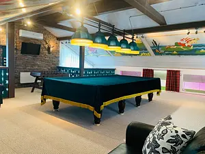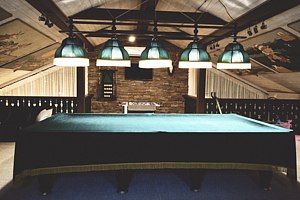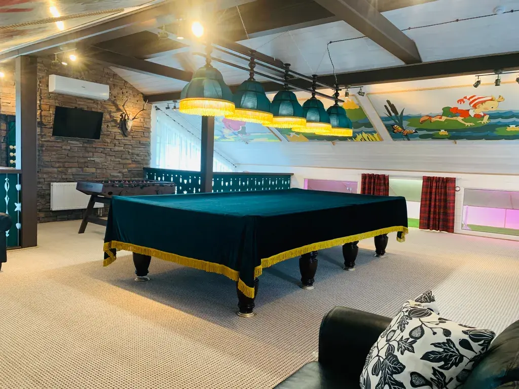 Русский бильярд, большой профессиональный настольный киккер-футбол, мягкая зона с диванчиками и журнальными столиками для настольных игр, детский уголок с игрушками.