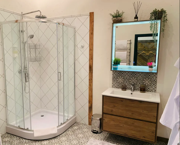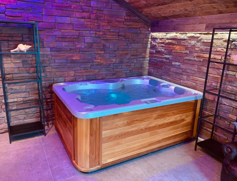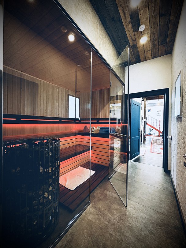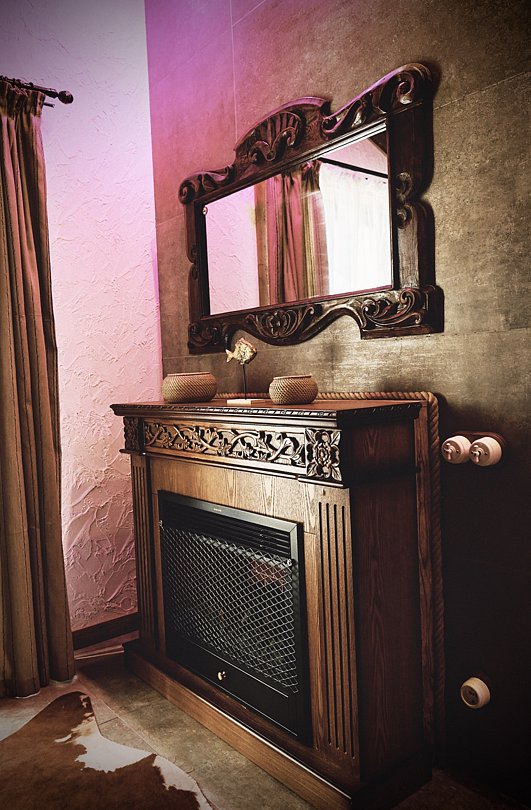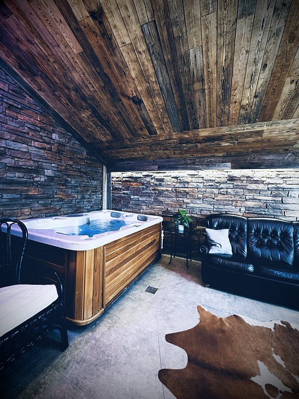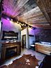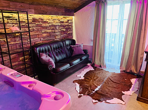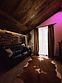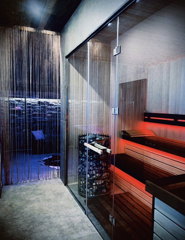 В небольшом, но очень уютном спа-пространстве, размещены просторная финская сауна с электрической печью «Sawo», гидромассажный спа-бассейн с атмосферной подсветкой и горячей бурлящей водой, душевая зона и комната отдыха с 3D камином и винтажным кожаным диванчиком на латунных ножках-колёсиках. Подогрев джакузи выполняется заранее, перед приездом гостей.