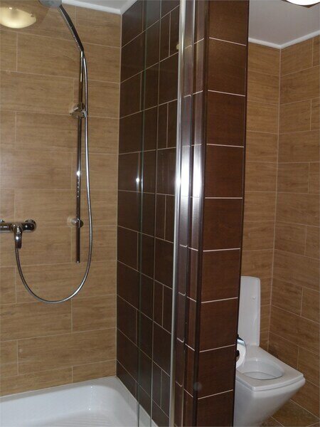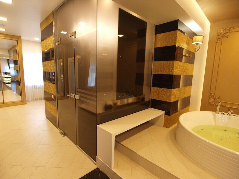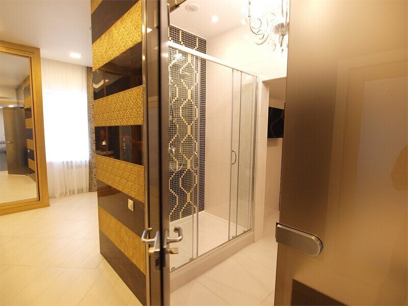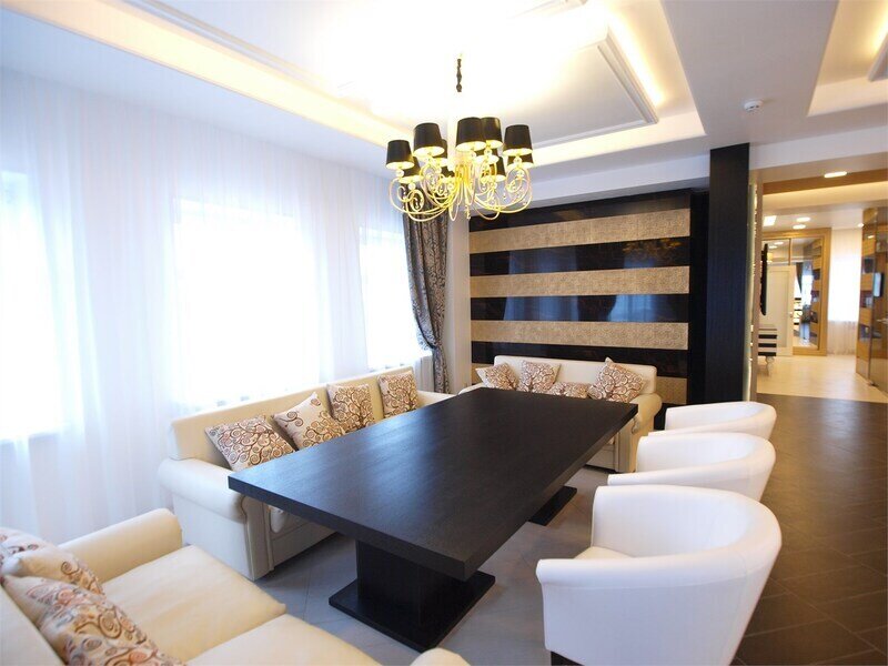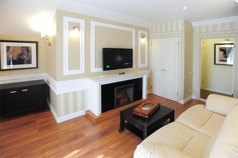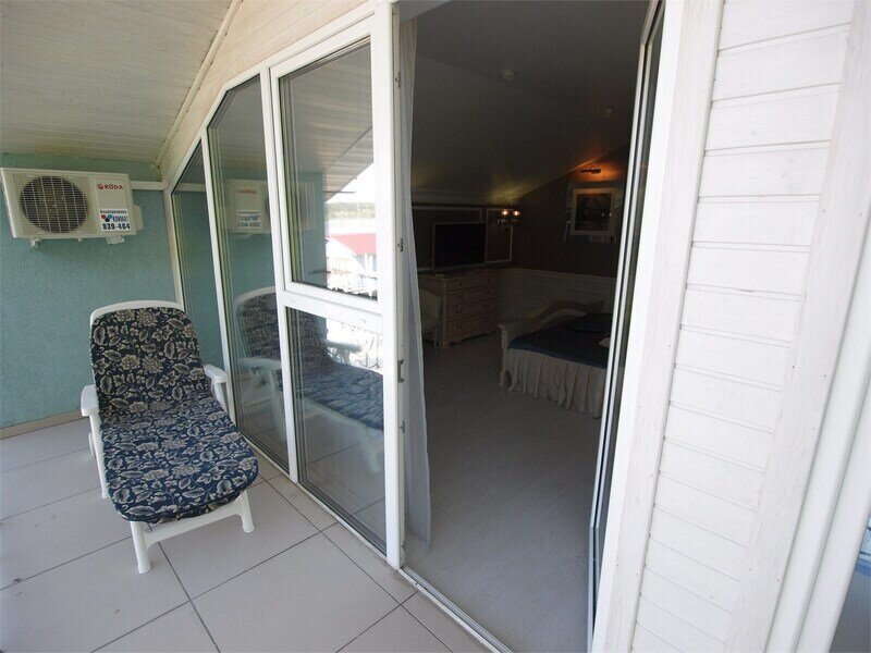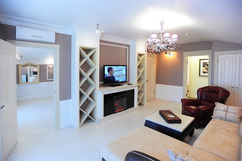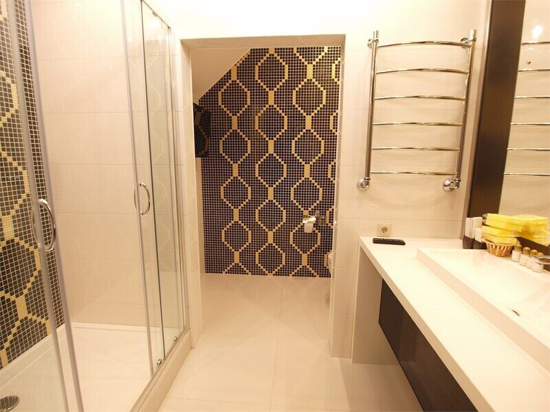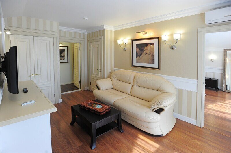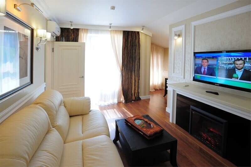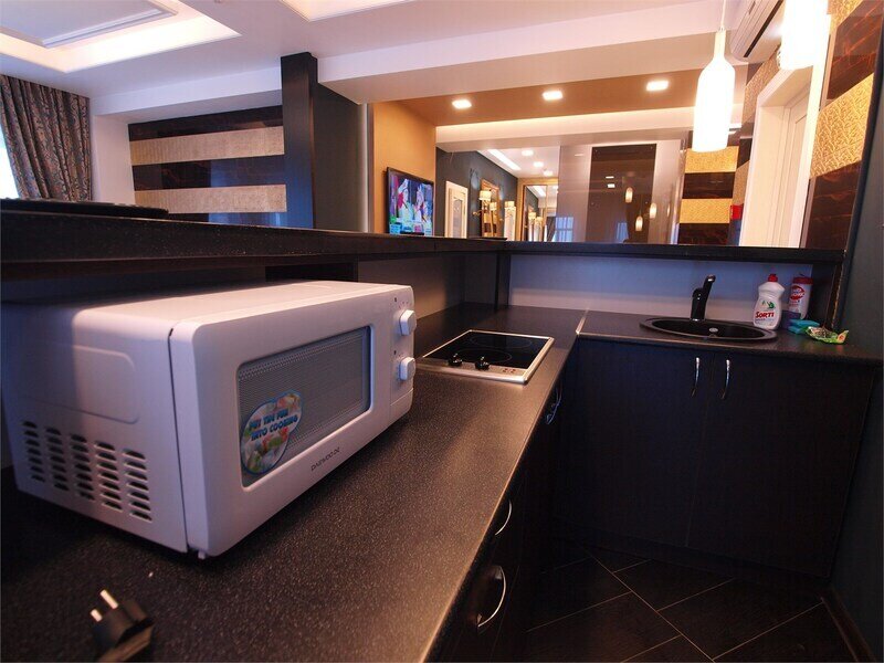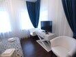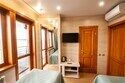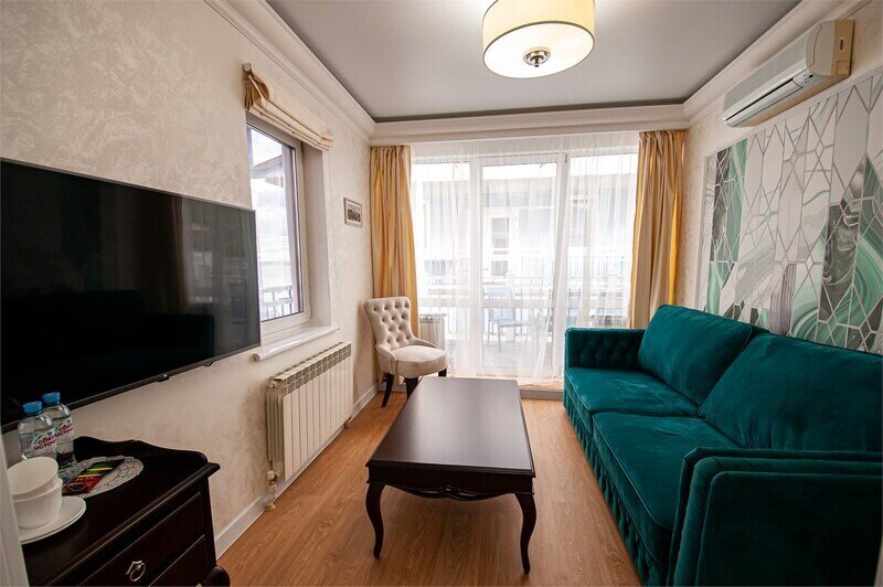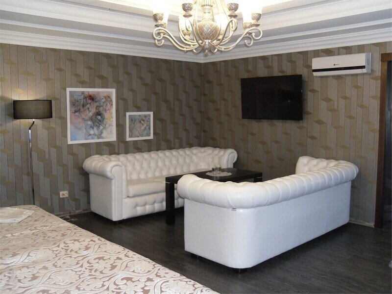 Столовая — гостиная: зона кухни, чайник, чайные пары, холодильник. Обеденный стол и 4 мягких стула, 2 мягких кресла, диван, ЖК телевизор, выход на балкон. В номере кроме ванной комнаты с душевой кабиной, есть минибассейн с гидромассажем, фен.