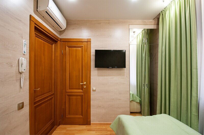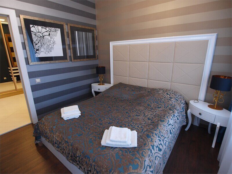 В спальне: одна 2-х спальная кровать с ортопедическим основанием, постельное бельё, 2 одеяла, подушки из натуральных антиаллергенных материалов, прикроватные тумбочки, ЖК телевизор, кондиционер.