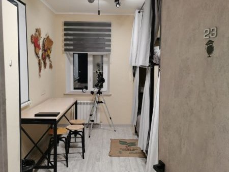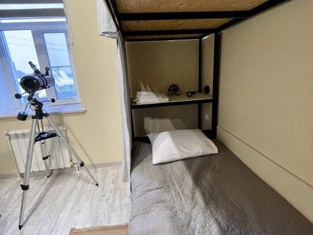 Душ на этаже Туалет на этаже Гардеробная комната Wi-Fi в номере Сейф у администратора Кровать в общем номере для четверых человек. Номер площадью 18 м2 В номере: две двухярусные односпальные кровати проектор зеркало 2 шт письменный стол и стулья телефон У каждой кровати: шторы ночник полка розетка + USB розетка вентилятор отдельный шкаф с ключом (комплект полотенец, коврик) Удобства: душевая комната на этаже (душ, тропический душ, туалет, фен, полотенцесушитель, полотенца) одноразовые тапочки кухня на этаже (холодильник, раковина, кофемашина, чайник, посуда) телевизор на кухнеВ номере