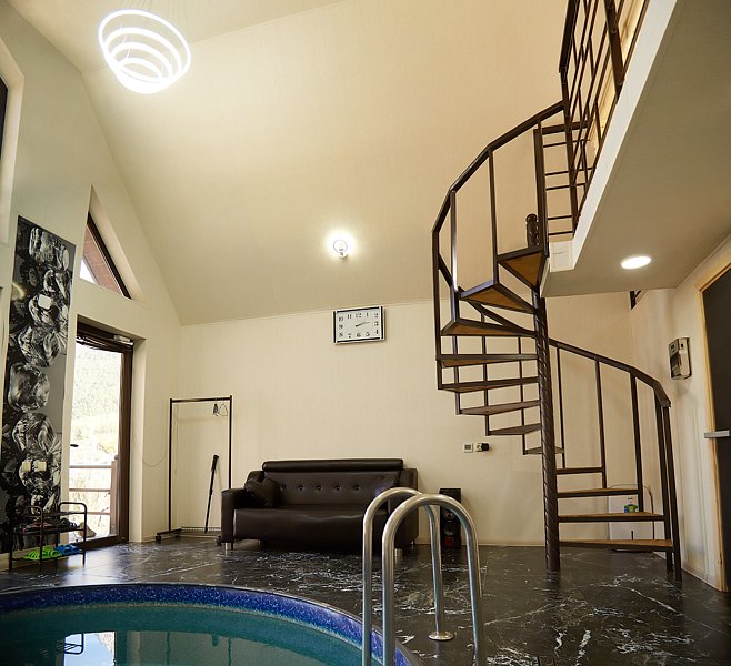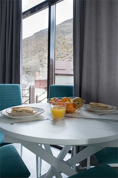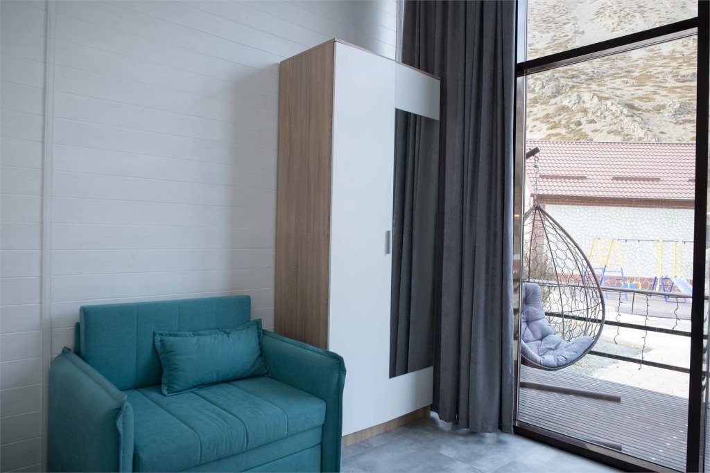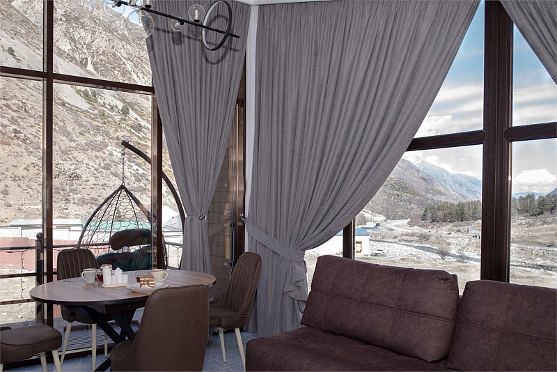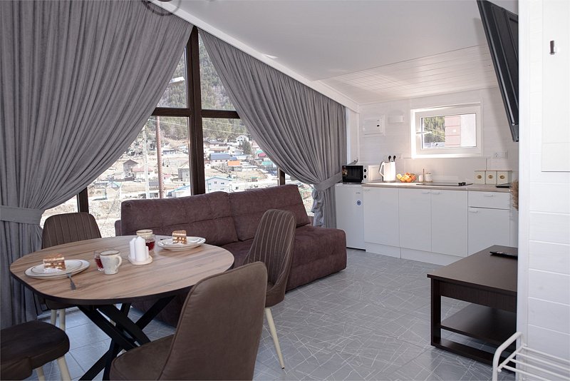 Одноэтажные Лофт коттеджи позволят вам наслаждаться пейзажем прямо из спальни. Каждый объект оборудован современной кухней, ванной и всем необходимым для комфортного проживания. На территории комплекса есть частная парковка, охрана, детская площадка и сауна с подогреваемым бассейном. В завершение, попробуйте чайные сборы с горными травами для полного погружения в атмосферу природы.