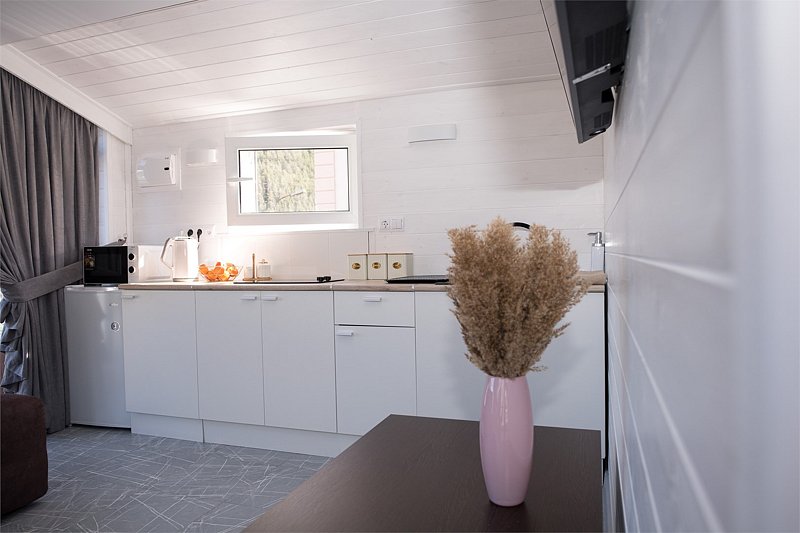 Домик 40 кв/м, две комнаты, санузел, в гостиной полноценная кухня. В каждом домике имеется всё для комфортного отдыха, холодильник, телевизор, WiFi, микроволновая печь, варочная панель, электрочайник, большой телевизор.