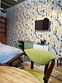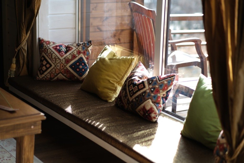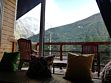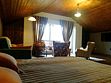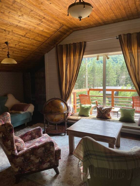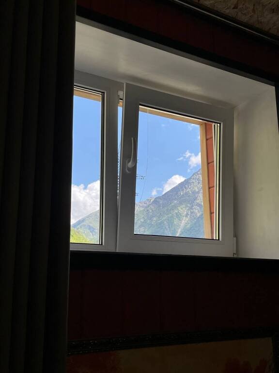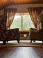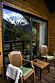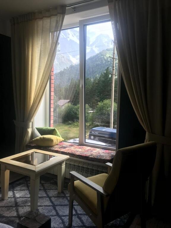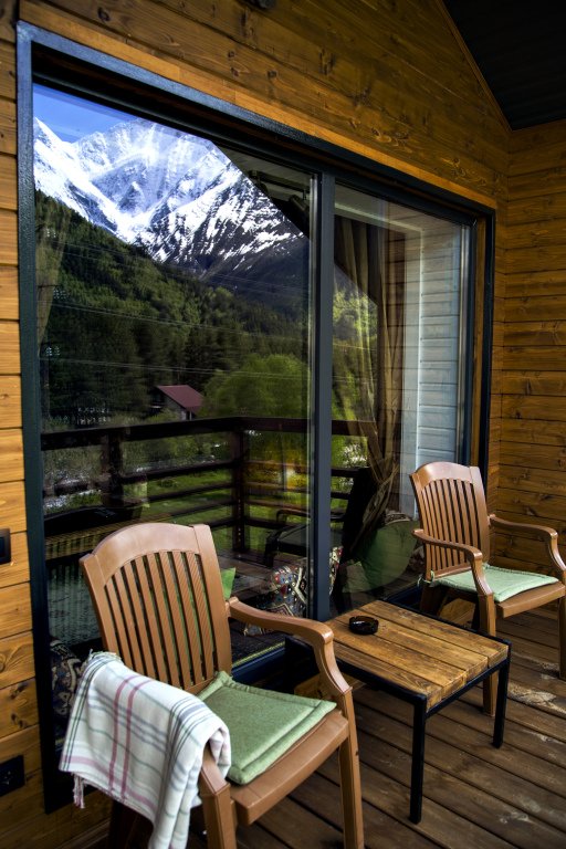В номерах на втором и третьем этажах есть подоконники-диваны с витражными окнами с видом на горы, ледники и лес.