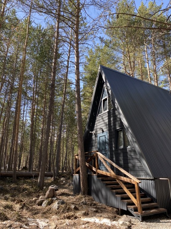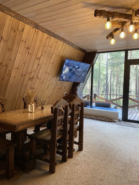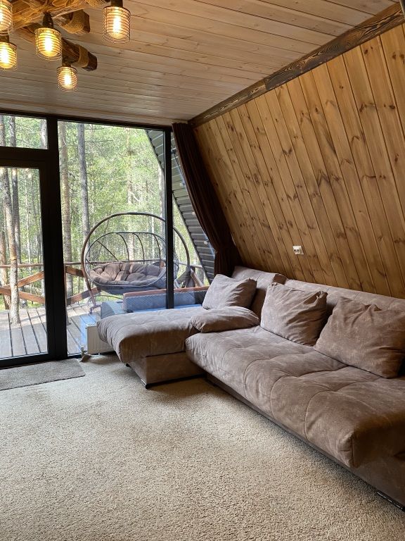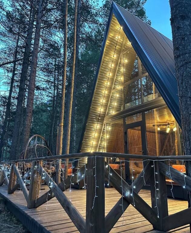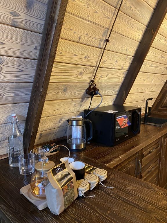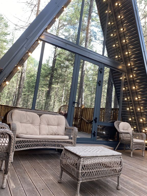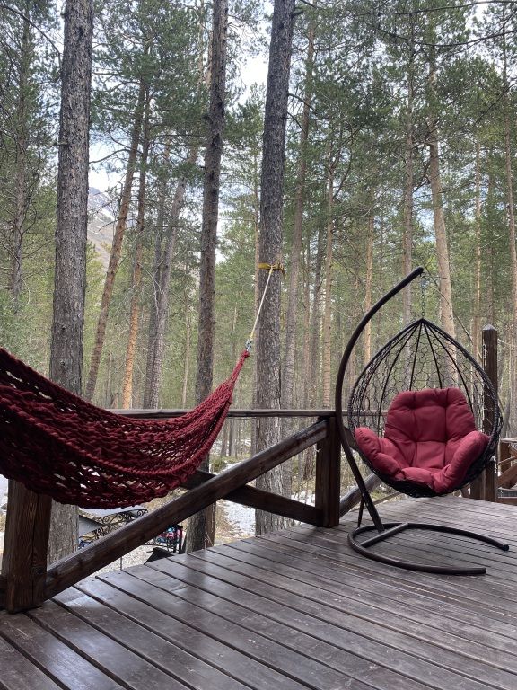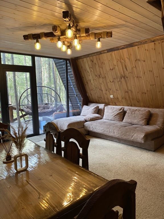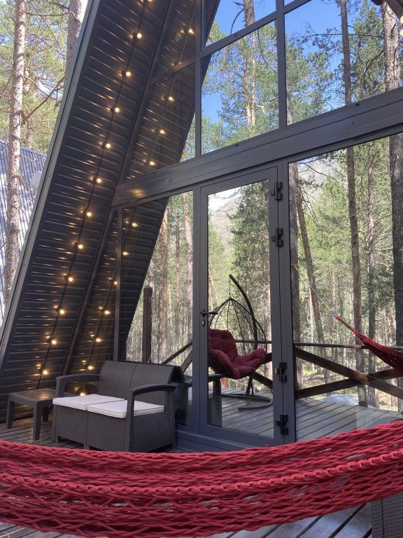 Дом оборудован просторной верандой, где можно отдыхать на уличной мебели, расслабляться в гамаке или качелях, наслаждаясь окружающей природой. Внутри дома есть все необходимое для комфортного проживания: смарт-телевизор, доступ к Wi-Fi, холодильник, микроволновая печь, электрический чайник, фен, а также индивидуальный набор гигиенических средств.
