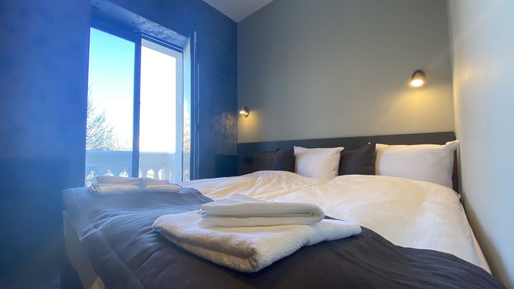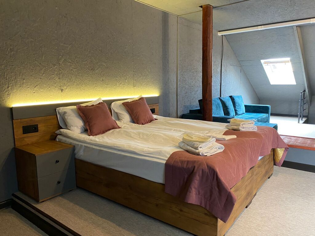 «Двухуровневые Апартаменты» с кухней площадью 80 м² вмещают до 6 человек. Это отличный выбор для семьи с детьми или большой компании. В номере: двуспальная кровать бокс-спринг (можно раздвинуть) с удобными матрасами, два больших раскладных дивана, два кресла, плоский телевизор, полностью оборудованная кухня с посудой, холодильником и плитой. В ванной: душевая кабина, тропический душ, фен, банные принадлежности (шампунь, гель для душа, жидкое мыло), гигиенический душ, тапочки, полотенца.Стандарт 2-местный