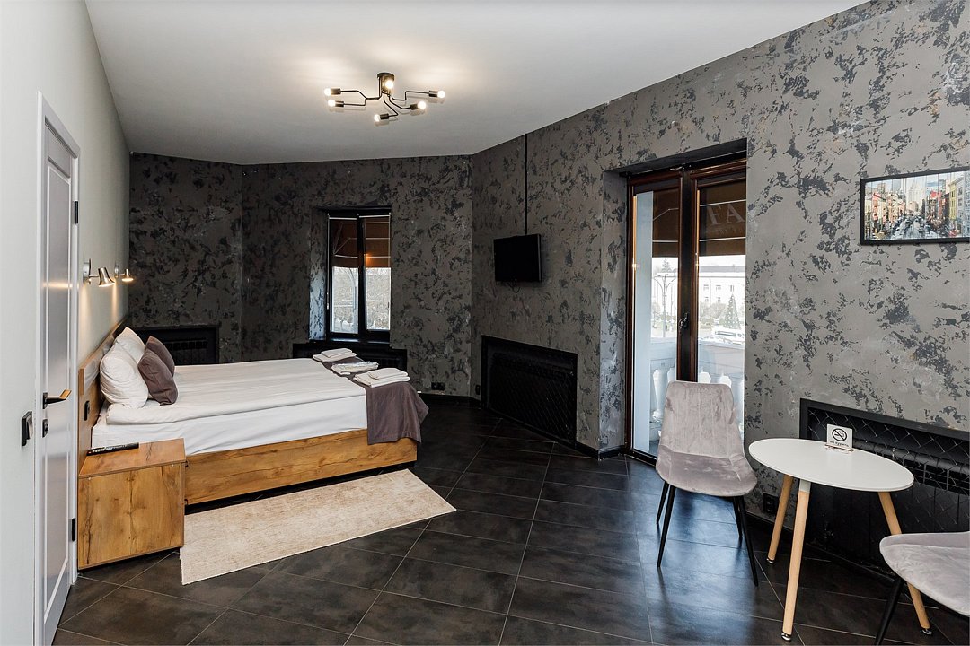 «Комфорт» с балконом в два раза просторнее «Стандарта». Здесь также есть все для приятного проживания: двуспальная кровать бокс-спринг (можно раздвинуть) с удобными матрасами, кондиционер, плоский телевизор, холодильник, чайный набор, электрический чайник, блэкауты на окнах для безмятежного сна. В ванной: душевая кабина, тропический душ, фен, банные принадлежности (шампунь, гель для душа, жидкое мыло), гигиенический душ, тапочки, полотенца. Во всех номерах этой категории (кроме одного) есть уютные французские балкончики с видом на город.Апартаменты двухуровневые