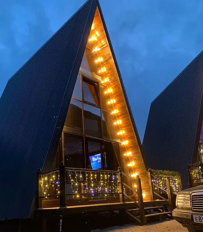 Очень комфортабельные коттеджи в стиле A-Frame на трёх уровнях, для комфортного проживания 6 человек (8 мест с диваном), построенные по эксклюзивному проекту с комнатой кроватью на 3-м этаже.