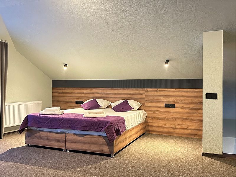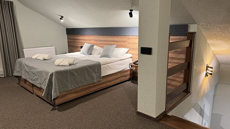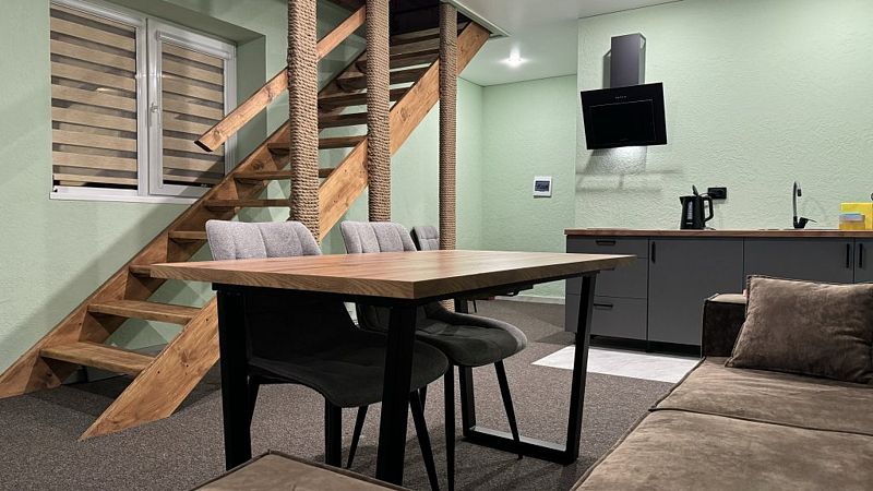 Двухуровневые апартаменты площадью 60 м² вмещают до 4 человек. В номере двуспальная кровать-трансформер (можно раздвинуть) с ортопедическими матрасами и раскладной диван, мебель, чайный набор, TV с плоским экраном и Smart-TV. Также номер оборудован личной кухней, где есть плита, холодильник и посуда. На дверях электронные замки с входом по ключ-карте. В ванной комнате: душевая кабина, раковина, зеркало с подсветкой, унитаз, гигиенический душ, гигиенические средства (шампунь, гель для душа, жидкое мыло), фен, полотенцесушитель.Услуги и удобства