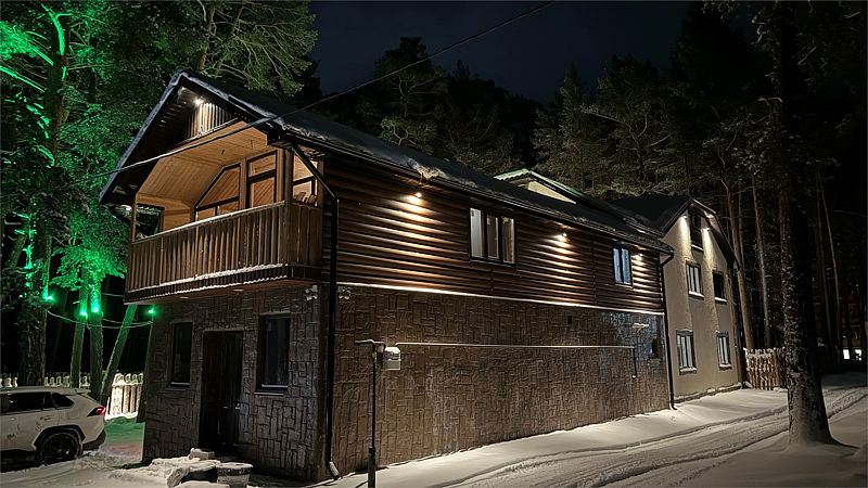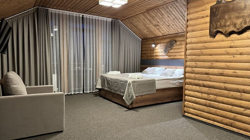 Двухэтажный коттедж площадью 85 м². Отлично подойдёт для семьи с детьми или большой компании друзей: вмещает до 6 человек. В номере двуспальная кровать-трансформер (можно раздвинуть) с ортопедическими матрасами, раскладной диван, два кресла-кровати, мебель, чайный набор, TV с плоским экраном и Smart-TV. Также номер оборудован личной кухней, где есть плита, холодильник и посуда. На дверях электронные замки с входом по ключ-карте. В ванной комнате: душевая кабина, раковина, зеркало с подсветкой, унитаз, гигиенический душ, гигиенические средства (шампунь, гель для душа, жидкое мыло), фен, полотенцесушитель. Также в коттедже есть балкон с прекрасным видом на сосновый бор и горы.Услуги и удобства