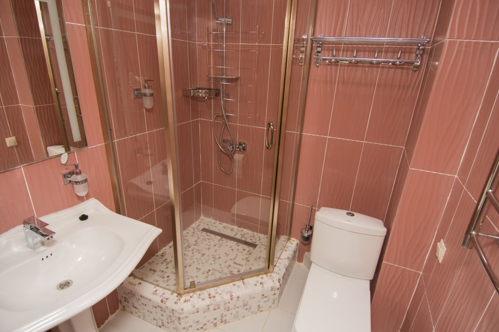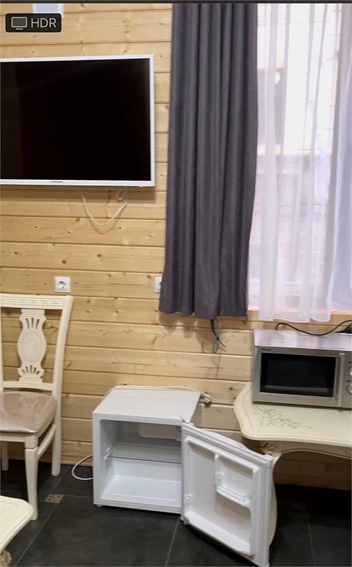 Номер 18 м2, со второго этажа имеются балконы, в комнате расположена большая двуспальная кровать с ортопедическим матрасом, также есть номера с двумя односпальными кроватями, две прикроватные тумбочки, телевизор, стол с тумбой, два стула, мини-холодильник, чайник, обогреватель, в прихожей шкаф с зеркалом, сейф, в санузле душевая кабинка, унитаз, раковина, зеркало с подсветкой, змеевик, фен.