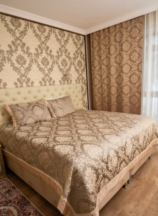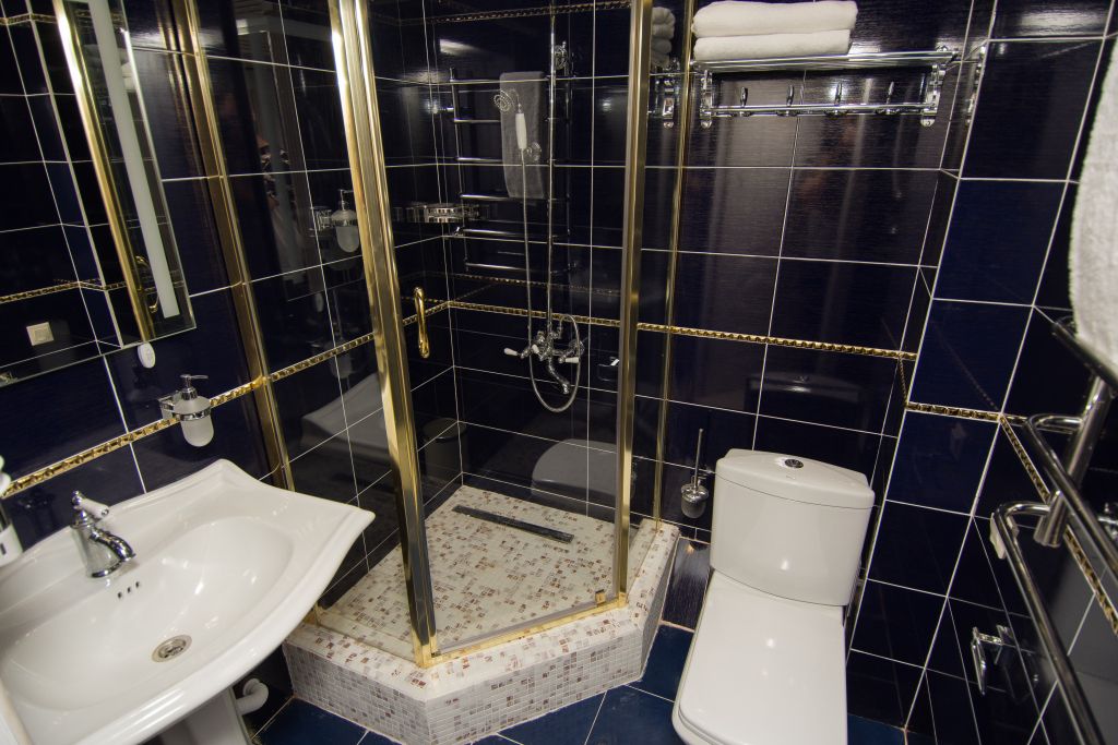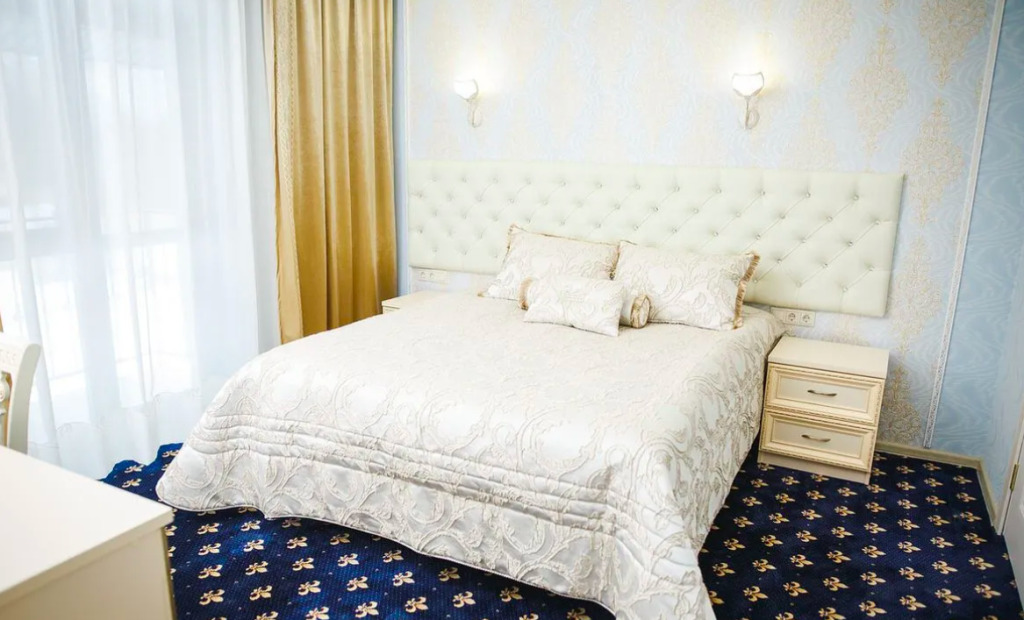 Номер 45 м2, две комнаты, одна спальная с панорамным окном и балконом, в комнате расположена большая двуспальная кровать с ортопедическим матрасом, две прикроватные тумбочки, телевизор, стол с тумбой, два стула, мини-холодильник, чайник, обогреватель, в другой комнате окно, раскладной диван, два кресла, журнальный стол, телевизор, гладильная доска, в прихожей шкаф с зеркалом, сейф. Два санузла, один в спальне с угловой ванной, унитаз, биде, раковина, зеркало с подсветкой, змеевик, фен, другой в коридоре унитаз, раковина, зеркало.