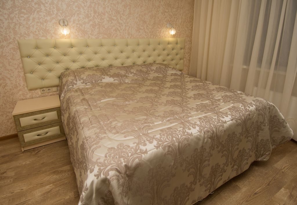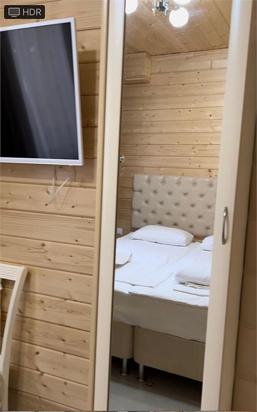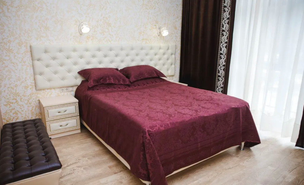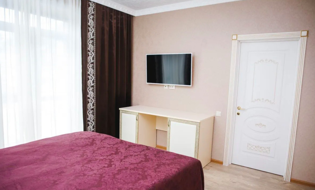 Номер 22 м2, со второго этажа имеются балконы, в комнате расположена большая двуспальная кровать с ортопедическим матрасом, также есть номера с двумя односпальными кроватями, две прикроватные тумбочки, раскладной диван, телевизор, стол с тумбой, два стула, мини-холодильник, чайник, обогреватель, в прихожей шкаф с зеркалом, сейф, в санузле ванна, унитаз, раковина, зеркало с подсветкой, змеевик, фен.