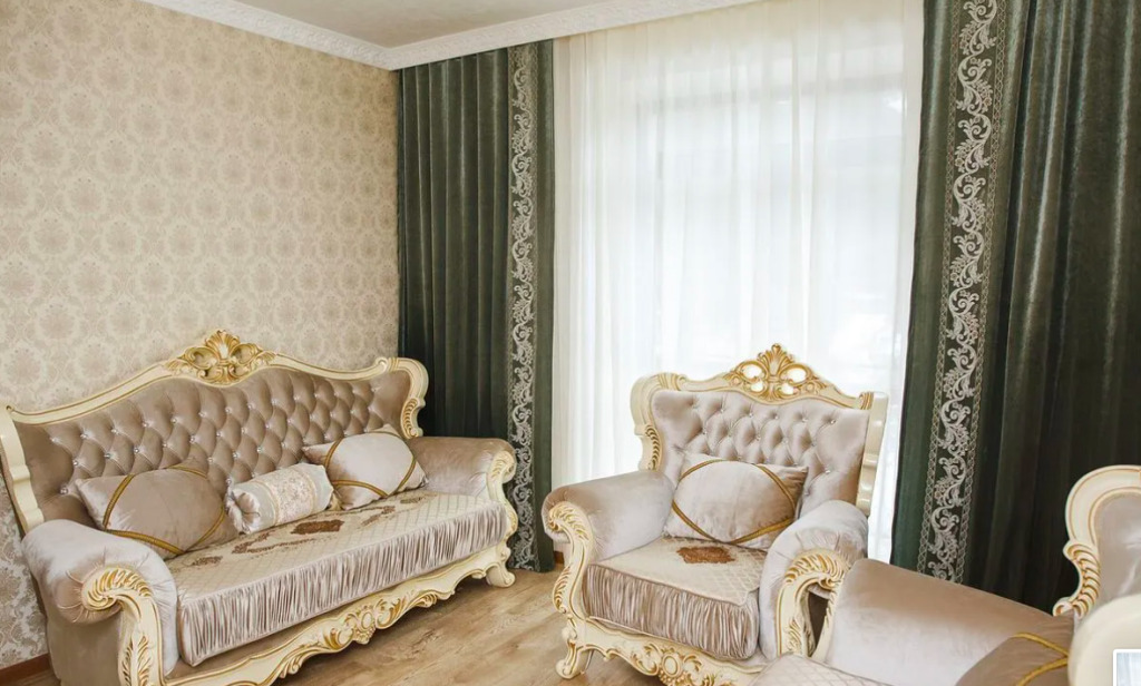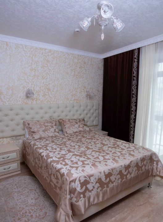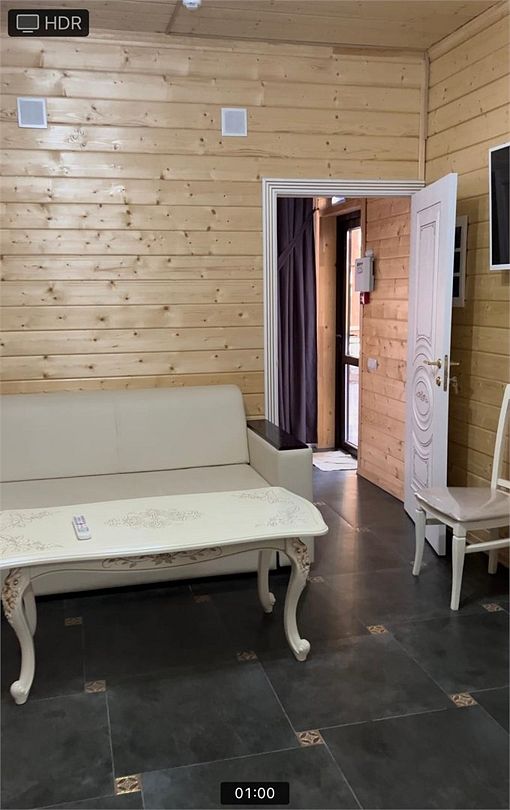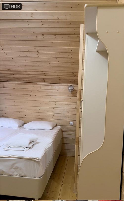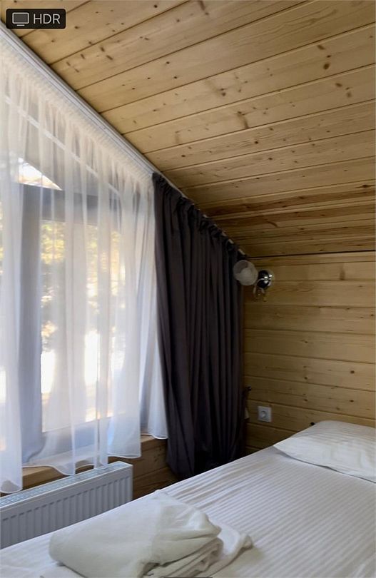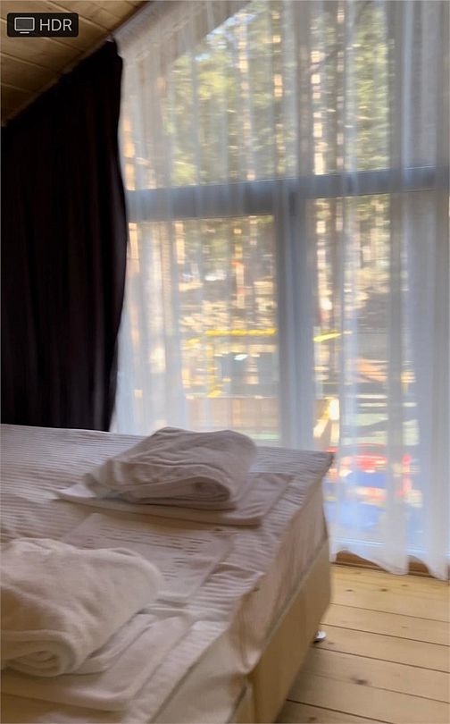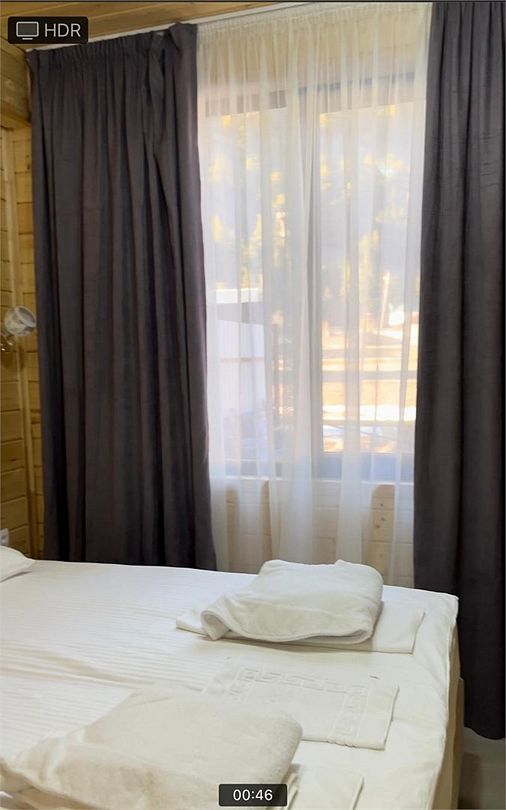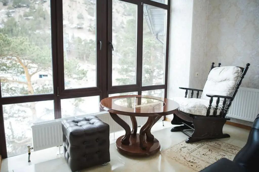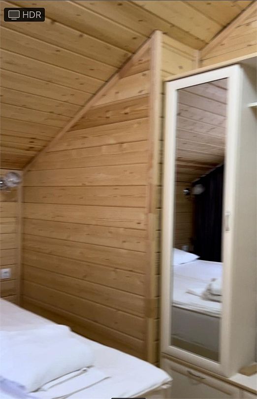Номер 75 м2, три комнаты, на 1 уровне две смежные комнаты, одна спальная с панорамным окном и балконом, в комнате расположена большая двуспальная кровать с ортопедическим матрасом, телевизор, стол с тумбой, два стула, мини-холодильник, чайник, обогреватель, в другой комнате одно окно, балкон с панорамным видом на ущелье, раскладной диван, два кресла, журнальный стол, телевизор, гладильная доска, при необходимости предоставляется детская кроватка до 3 лет, в прихожей шкаф с зеркалом, сейф. Три санузла, один в спальне с угловой ванной, унитаз, биде, раковина, зеркало с подсветкой, змеевик, фен, другой в коридоре унитаз, раковина, зеркало и на 2 уровне, унитаз и раковина. На 2 уровень (мансарда) одна большая комнат, в которой расположены три односпальные кровати с ортопедическими матрасами, две прикроватные тумбочки, журнальный столик, санузел (унитаз и раковина).