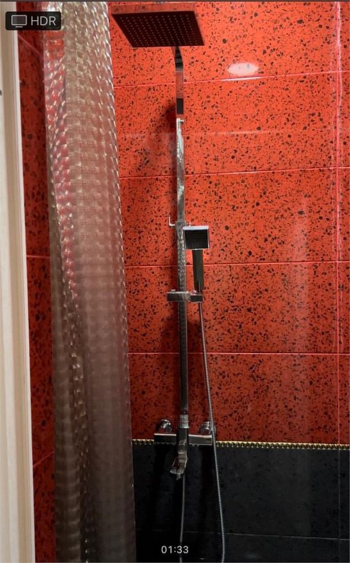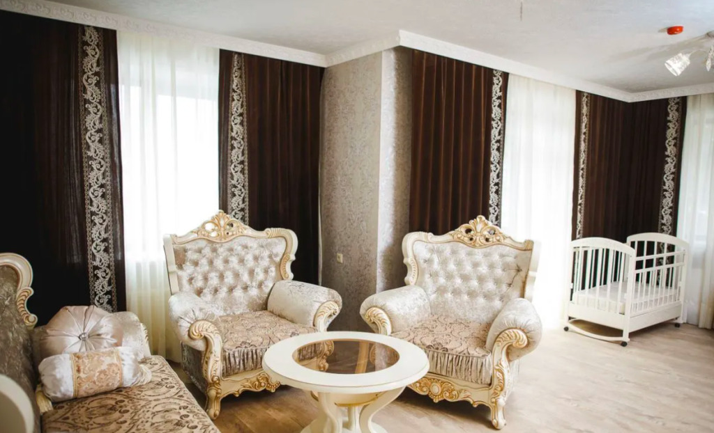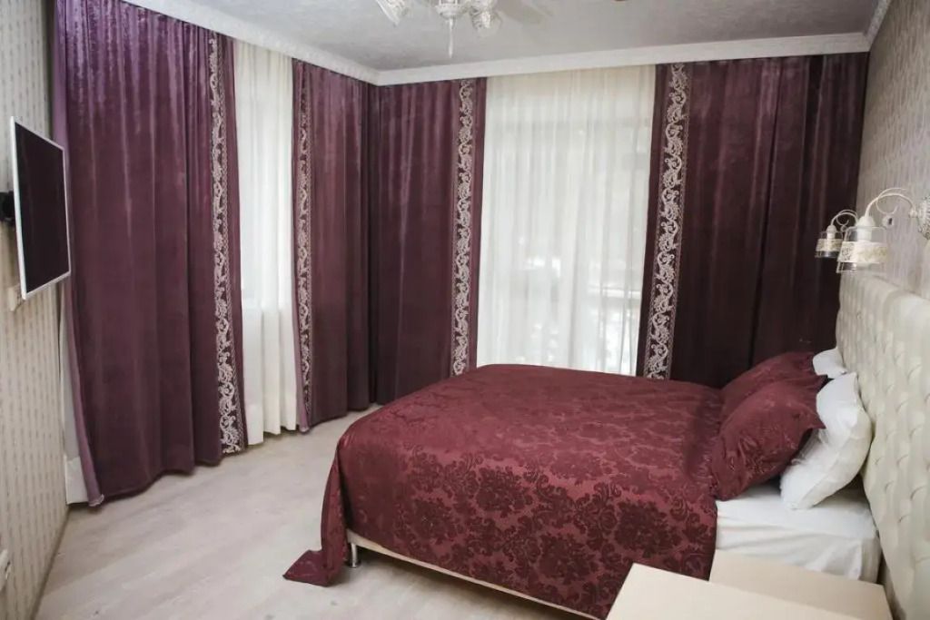 Номер 40 м2, две комнаты, одна спальная с панорамными окнами и балконом, в комнате расположена большая двуспальная кровать с ортопедическим матрасом, две прикроватные тумбочки, телевизор, стол с тумбой, два стула, обогреватель, в другой комнате окно, раскладной диван, два кресла, журнальный стол, телевизор, тумбочка-гладилка, мини-холодильник, чайник, в прихожей шкаф с зеркалом, сейф, в санузле душевая кабинка, унитаз, раковина, зеркало с подсветкой, змеевик, фен.