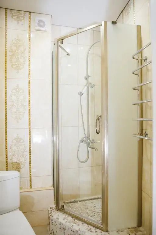 Номер 28 м2, две комнаты, одна спальная с панорамными окнами и балконом, в комнате расположена большая двуспальная кровать с ортопедическим матрасом, две прикроватные тумбочки, телевизор, стол с тумбой, два стула, мини-холодильник, чайник, обогреватель, в другой комнате панорамное окно, раскладной диван-малютка, кресло качалка, в прихожей шкаф с зеркалом, сейф, в санузле душевая кабинка, унитаз, раковина, зеркало с подсветкой, змеевик, фен.