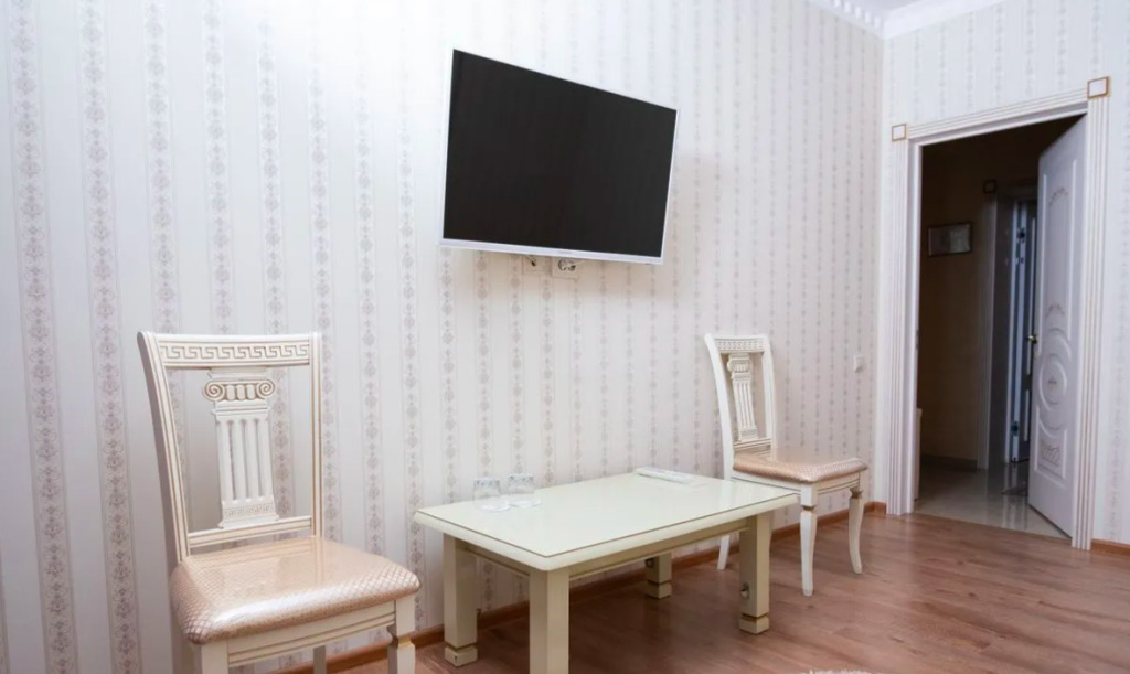 Номер 55 м2, две комнаты, одна спальная с панорамным окном и балконом, в комнате расположена большая двуспальная кровать с ортопедическим матрасом, две прикроватные тумбочки, телевизор, стол с тумбой, два стула, мини-холодильник, чайник, обогреватель, в другой комнате три окна, балкон с панорамным видом на гору Чегет, раскладной диван, два кресла, журнальный стол, телевизор, гладильная доска, при необходимости предоставляется детская кроватка до 3 лет, в прихожей шкаф с зеркалом, сейф. Два санузла, один в спальне с угловой ванной, унитаз, биде, раковина, зеркало с подсветкой, змеевик, фен, другой в коридоре унитаз, раковина, зеркало.