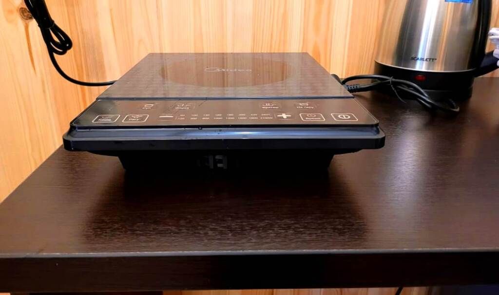 Мини-кухня включает электрический чайник, микроволновую печь, варочную панель, набор посуды и холодильник.