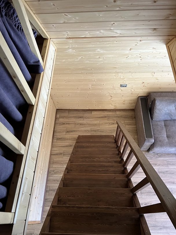 На первом этаже расположена просторная гостиная с большим угловым раскладным двух-спальным диваном, а также столовой, оборудованной кухней и санузлом. На втором этаже уютное двуспальное место.