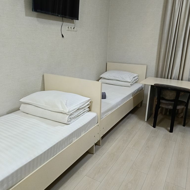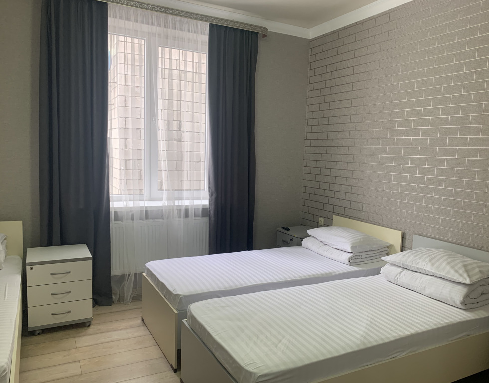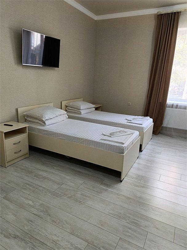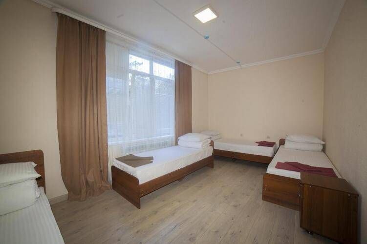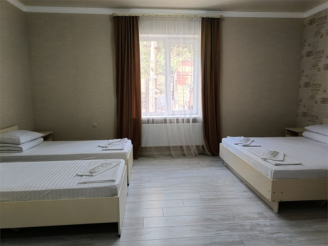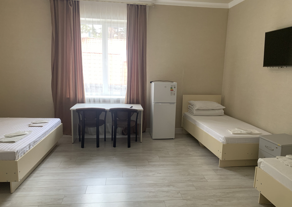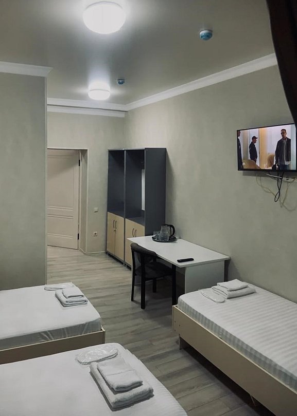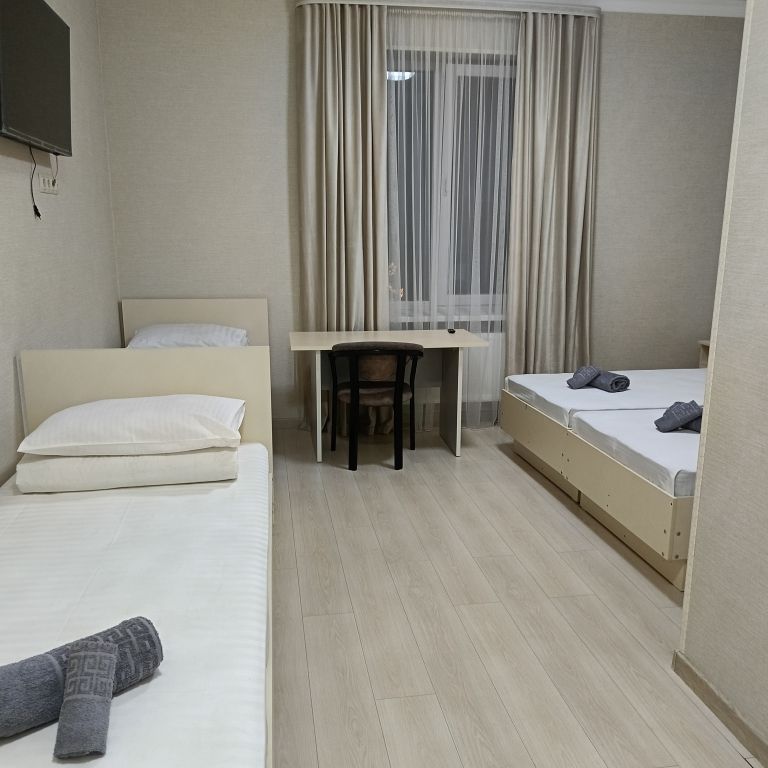 Просторные 3-местные номера для бюджетного проживания. Кровати с ортопедическими матрасами, постельное белье премиального качества. Санузел совмещенный, душевой поддон и вся ванная комната отделана кафельной плиткой, качественная сантехника, зеркало, банные принадлежности. В номере wi fiУслуги и удобства