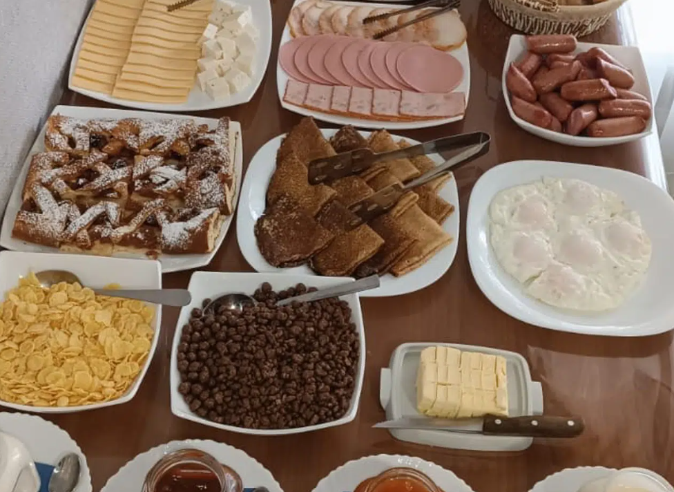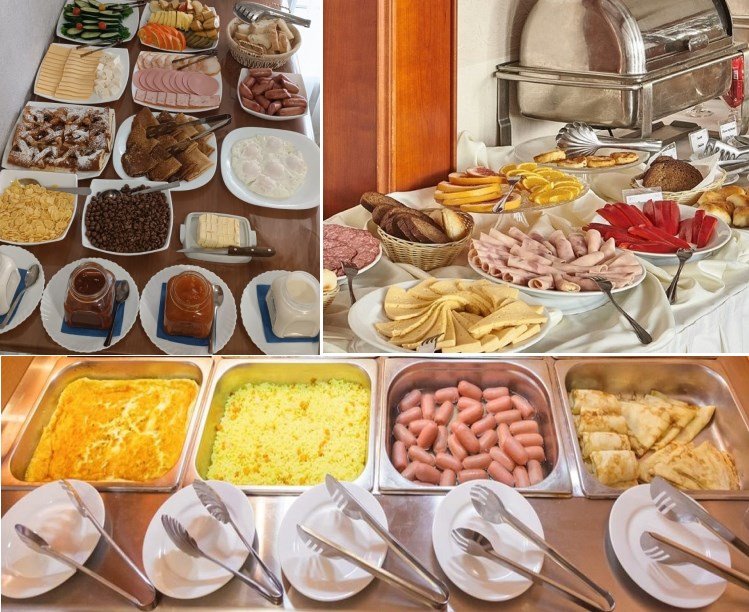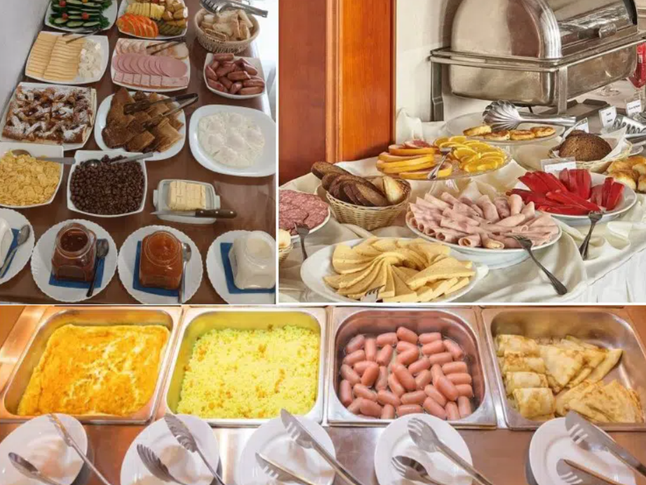 Завтрак «Шведский стол» включает различные каши, омлет, яичницу, сосиски, сырную нарезку из двух-трех сортов сыра, колбасную нарезку из разных сортов ветчины и колбасы, домашнюю выпечку (оладьи, блины, сырники или творожная запеканка чередуются), свежевыпеченный хлеб, хлопья, молоко, сметана, йогурт, сливочное масло, сгущенное молоко, различные соусы, майонез, овощную нарезку (огурцы, помидоры), фрукты (яблоки, апельсины, бананы, персики), лимоны, чай, кофе.