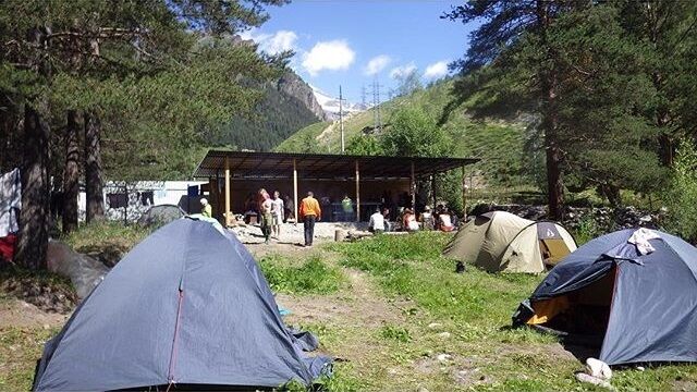 Если Вы традиционно комфортному отдыху в отеле предпочитаете более экстремальное единство с природой Приэльбрусья, то Вам - сюда. Площадка для кемпинга в тихом сосновом бору, на берегу горной реки Терскол c живописным видом на вершины Кавказа - отличная возможность отдохнуть перед восхождением на Эльбрус или акклиматизироваться.