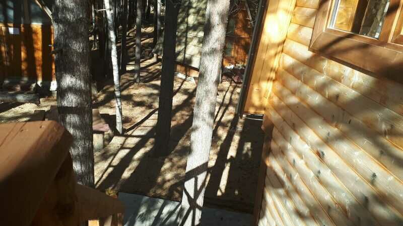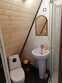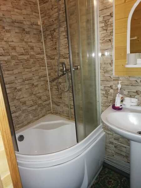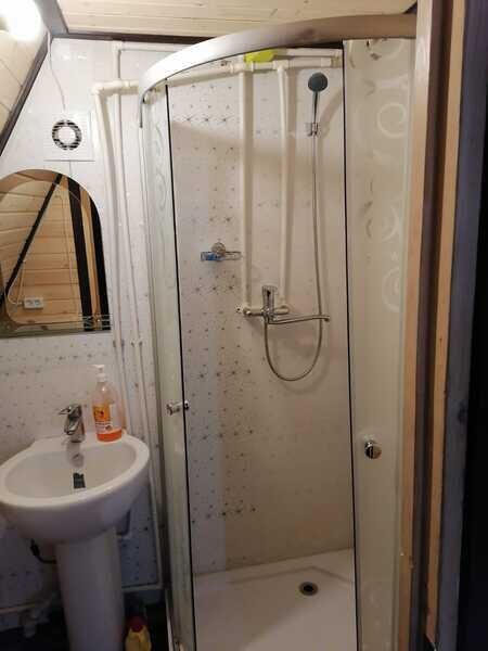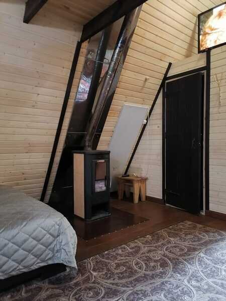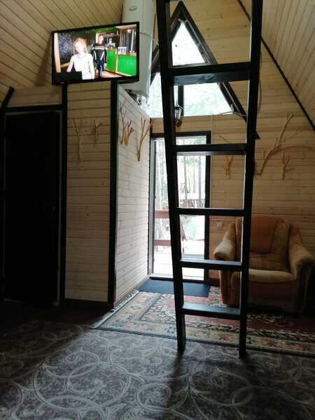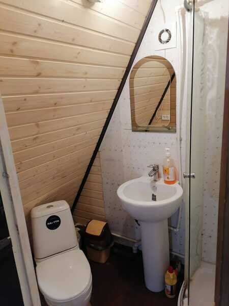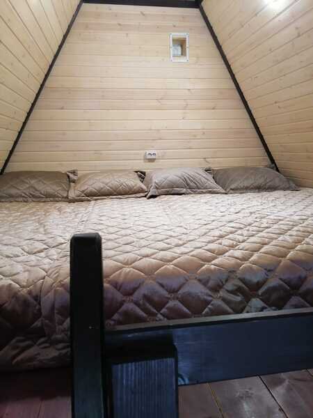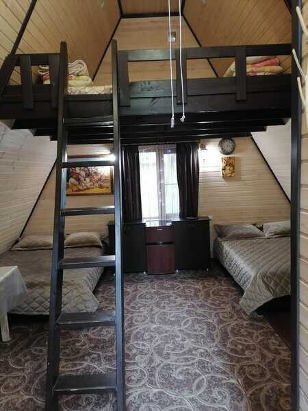На первом этаже расположены 2 двуспальные кровати и односпальная кровать, душевая зона с санузлом, раковиной и туалетом. На втором этаже 4 спальных места.