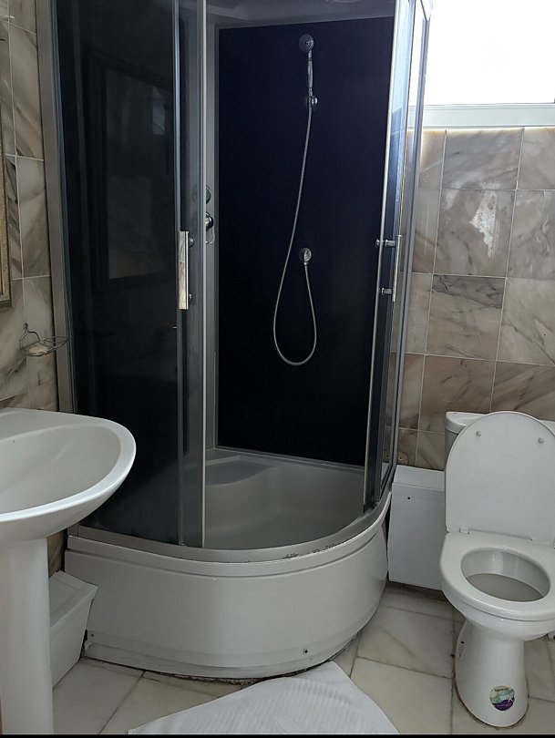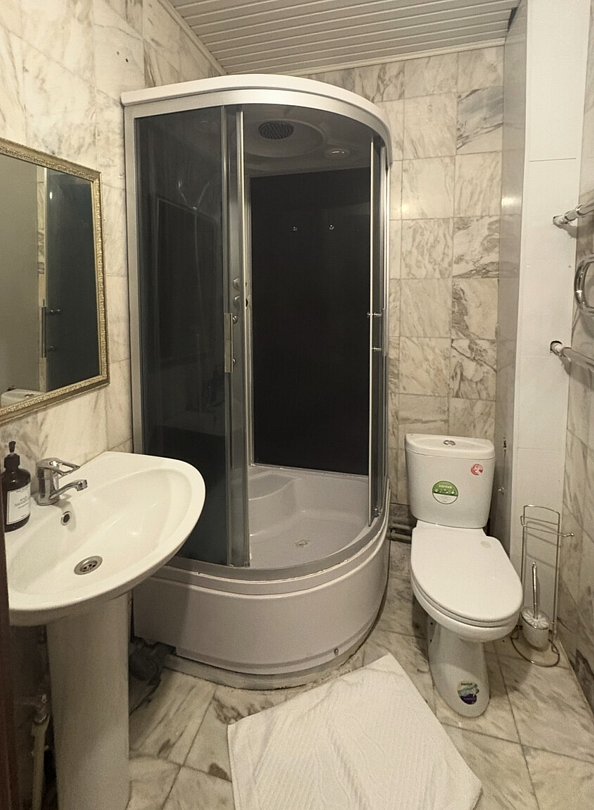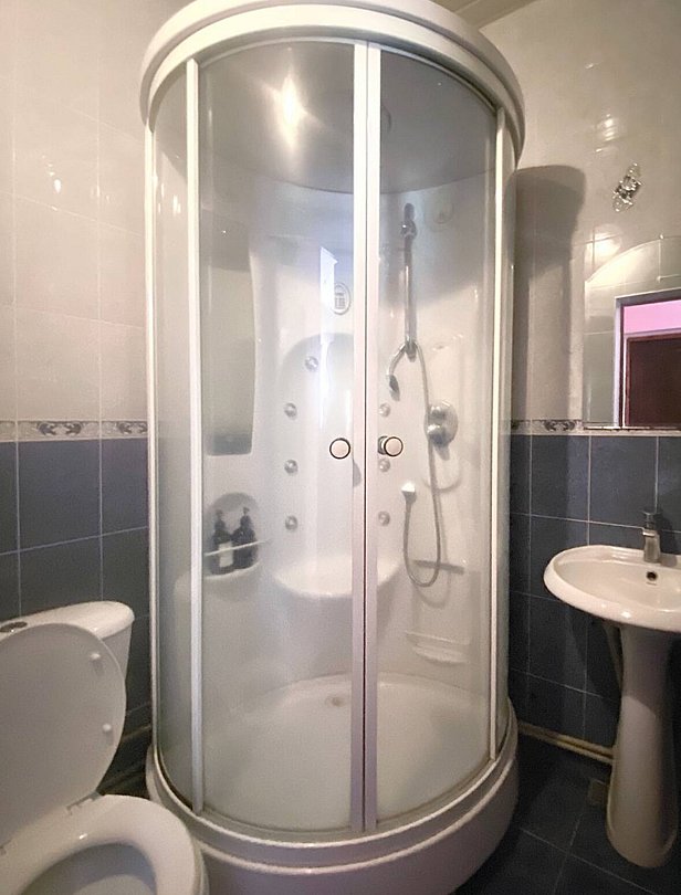 Сан узел с душевой кабиной и туалетом.