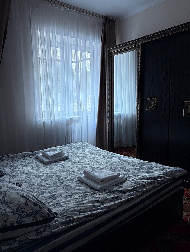 Большой светлый номер с двухспальной кроватью и диваном со своим отдельным входом.